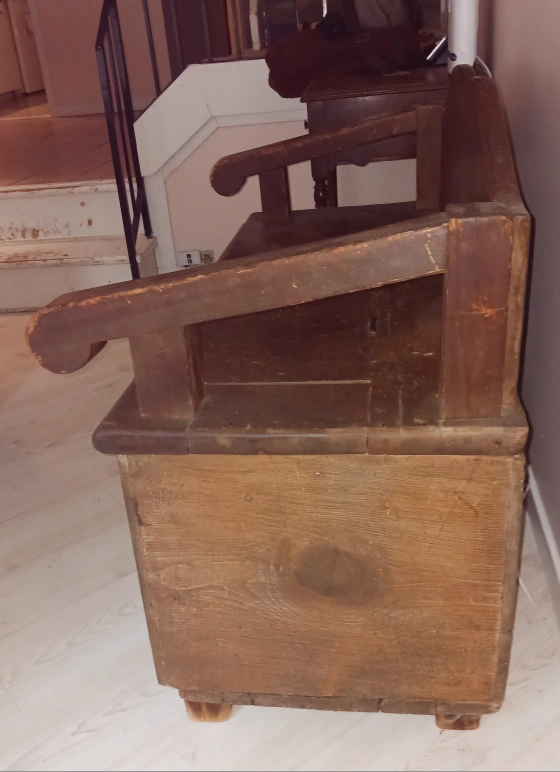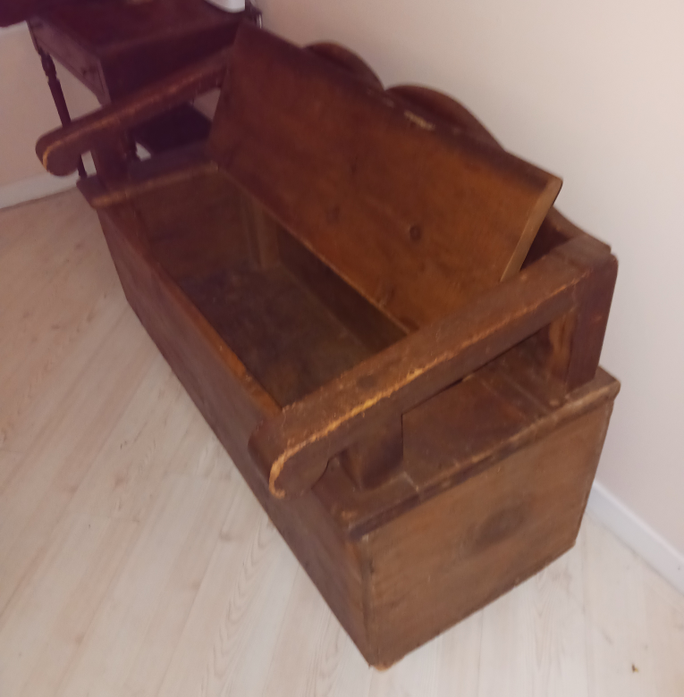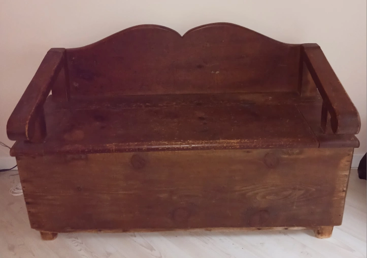 This charming solid bench was a farmhouse storage box with arms and back added in the early 1900s. It shows the wear and tear of the years but would be okay to refinish too.