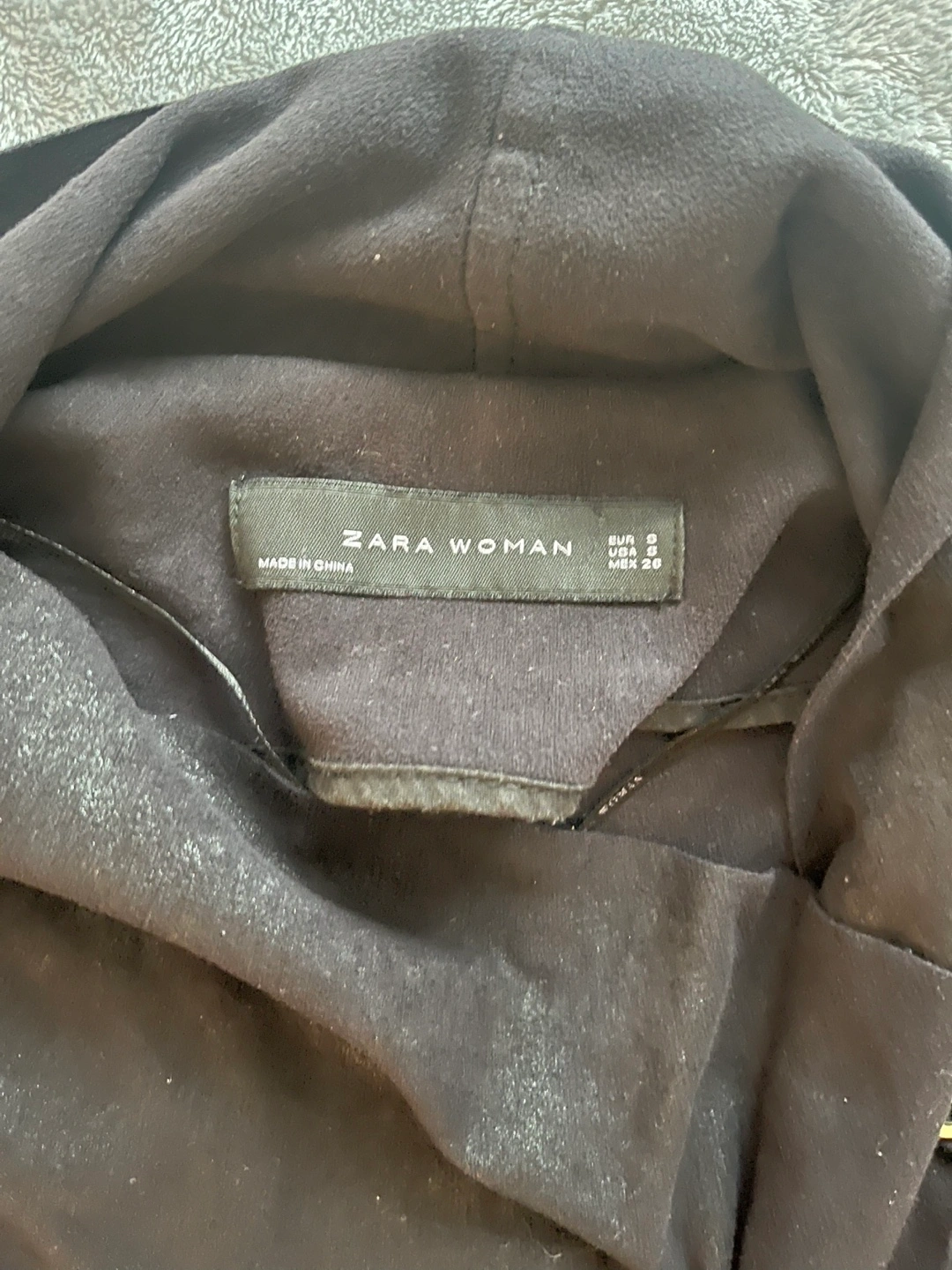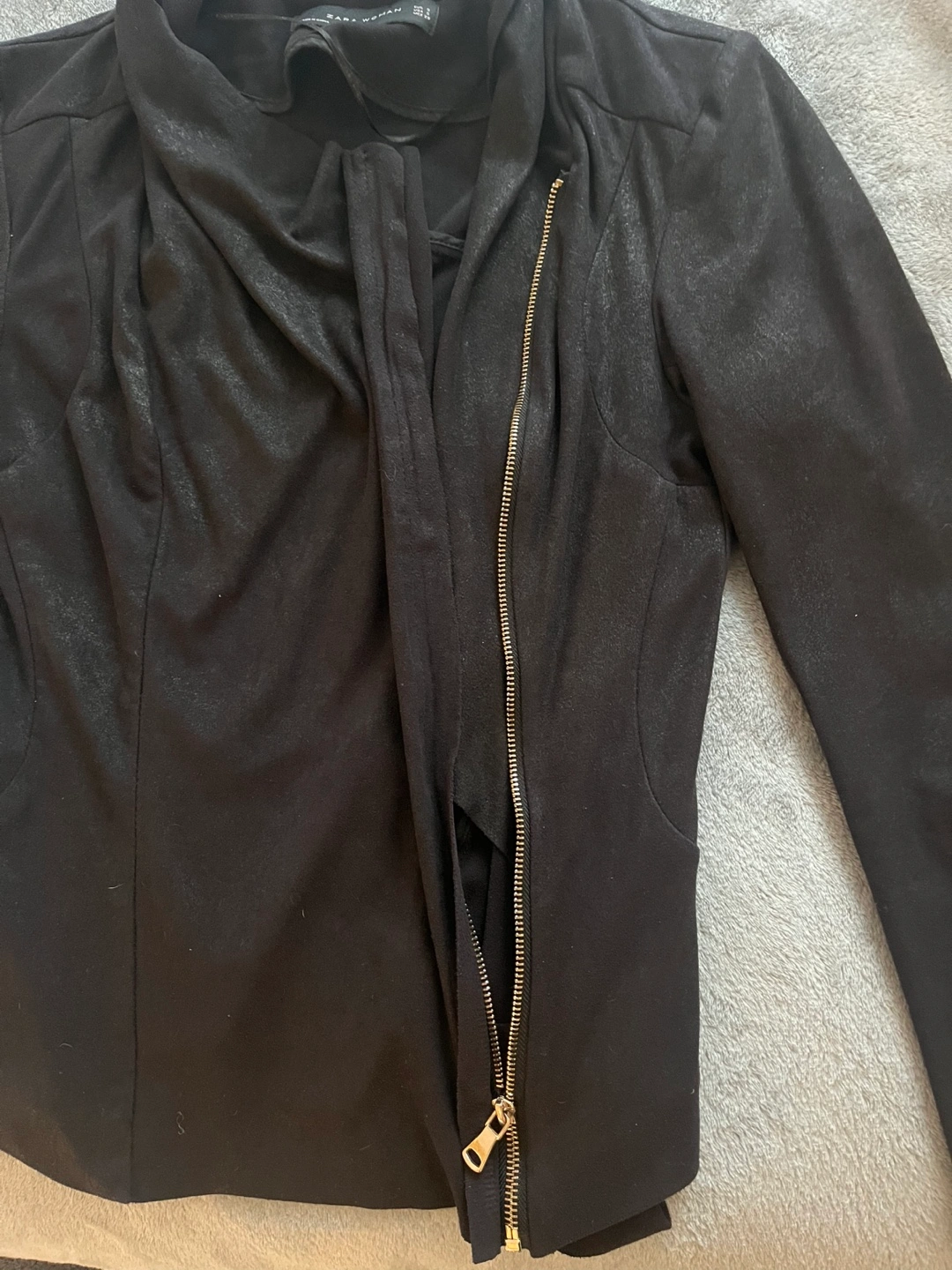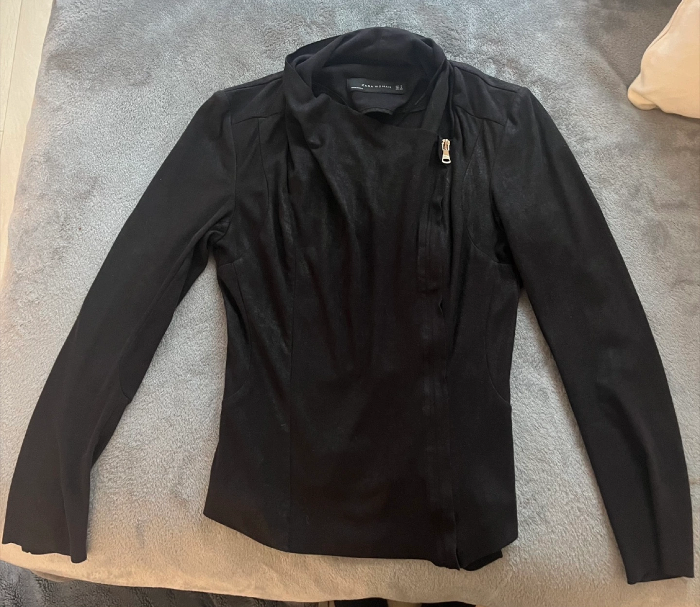 Selling a Zara Woman black jacket in size small. It's in good condition and ready for a new home! The jacket features a unique asymmetrical zipper closure and a stylish design. Perfect for adding a touch of edge to your wardrobe