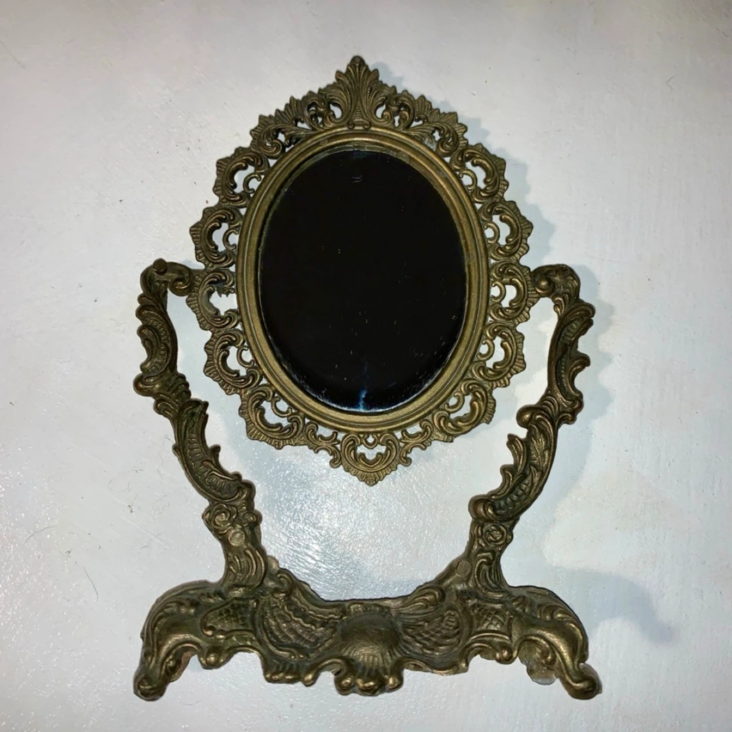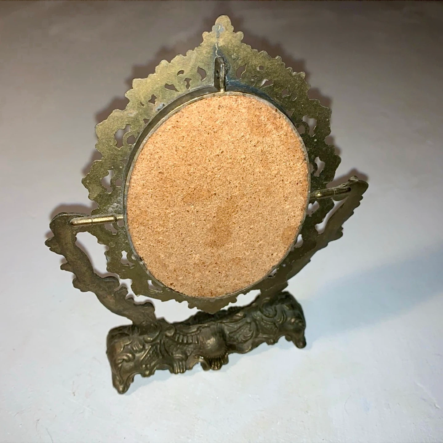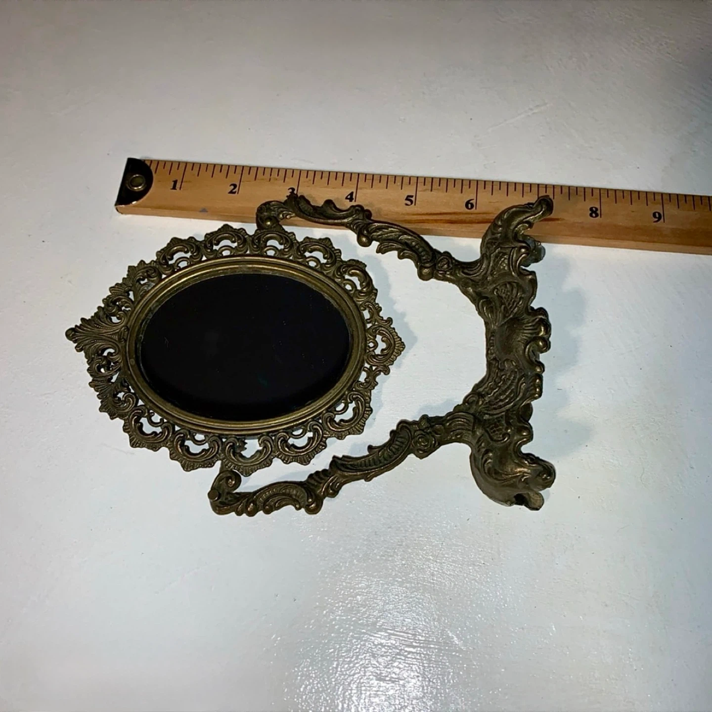 A pre-owned ornate tabletop mirror with a bronze-toned finish. The mirror features an oval shape surrounded by an intricate, scrolled frame, mounted on a decorative stand. The back of the mirror is covered with a cork material. Visible signs of age include some discoloration and some patina on the metal. View photos carefully and see measurements. The mirror itself is in excellent condition with no scratches or flaws to note. It can also make a picture frame.