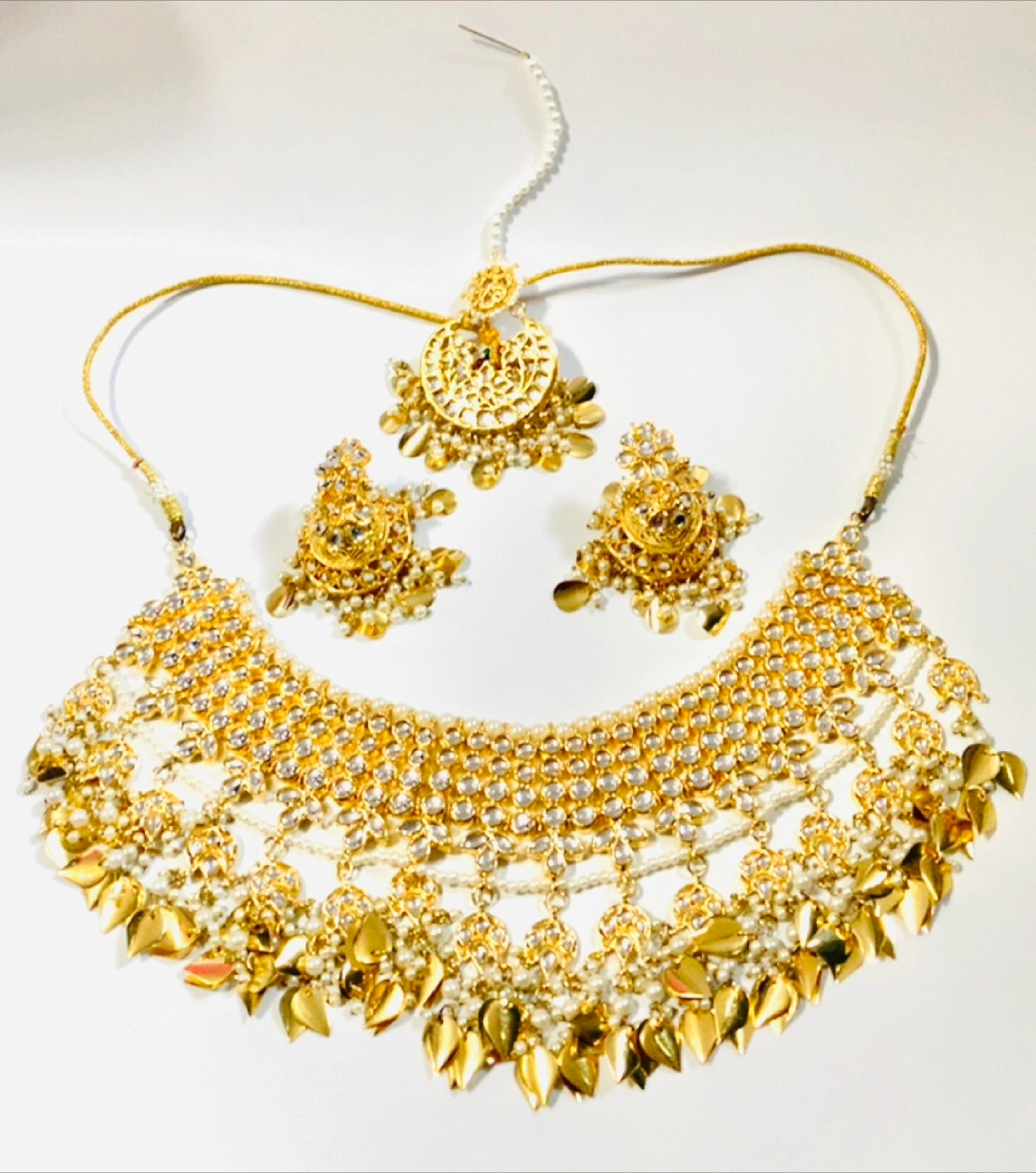 Beautiful gold-tone Indian jewelry set, perfect for adding a touch of elegance to any outfit! Includes a necklace, earrings, and a headpiece. The set features intricate detailing and a classic design.