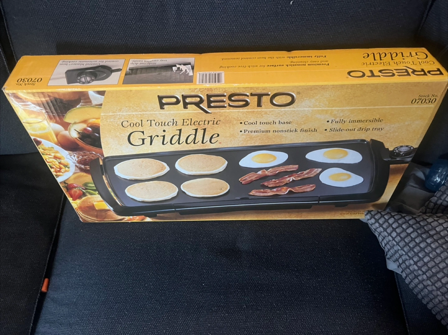 Selling a Presto Cool Touch Electric Griddle! It features a premium nonstick surface for easy cooking and cleaning. The heavy cast aluminum base is virtually warp-proof and has a built-in backstop ledge for easy food handling. It's fully immersible and dishwasher safe with the heat control removed. The dimensions are 11.5D x 22.5W x 2.4H centimetres and it runs at 1.5E+3 wattage