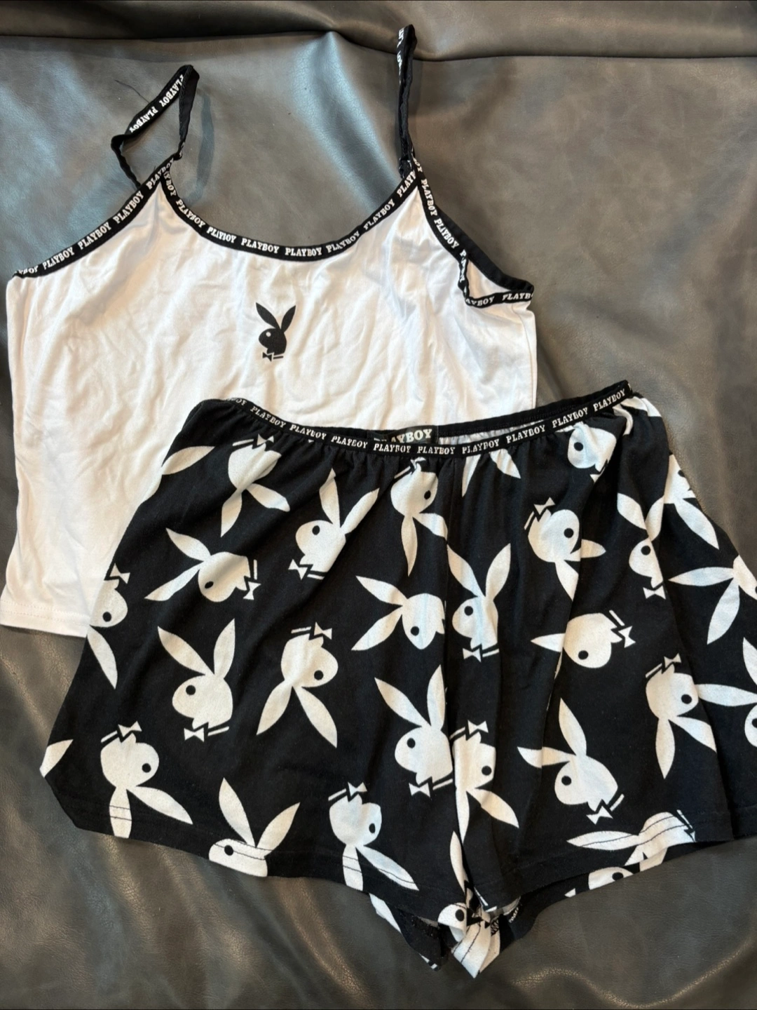 Super cute Playboy pajama set. The top is white with the Playboy logo, and the shorts are black with a white Playboy bunny pattern. Perfect for lounging around the house.