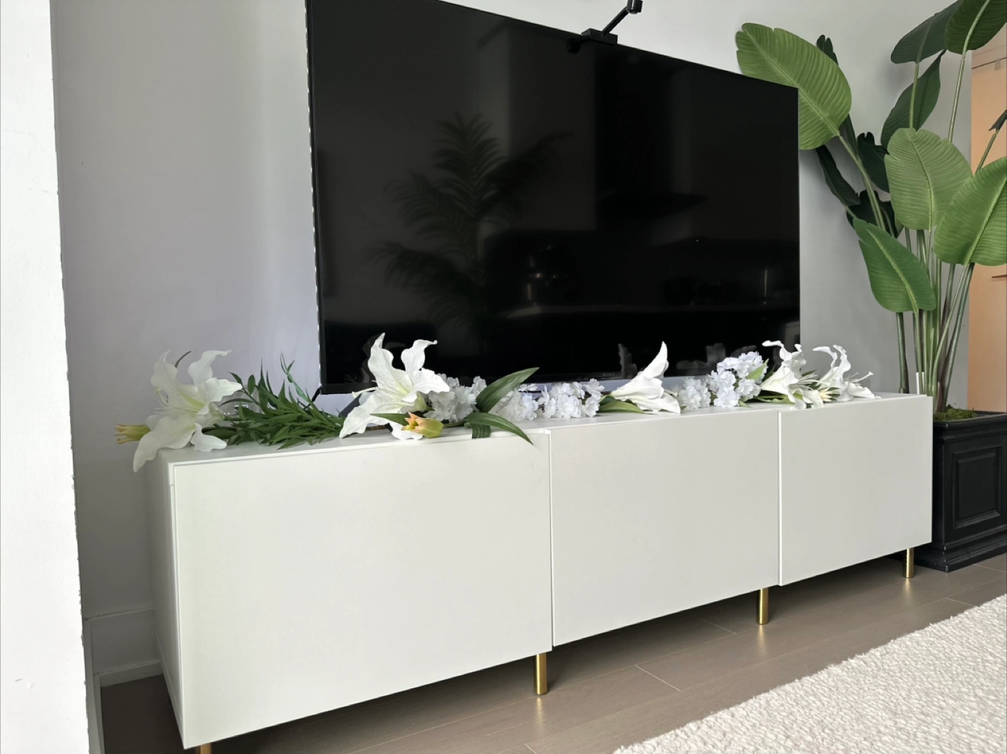 Selling a stylish white TV stand featuring sleek gold legs! It's in great condition and ready to elevate your living room setup