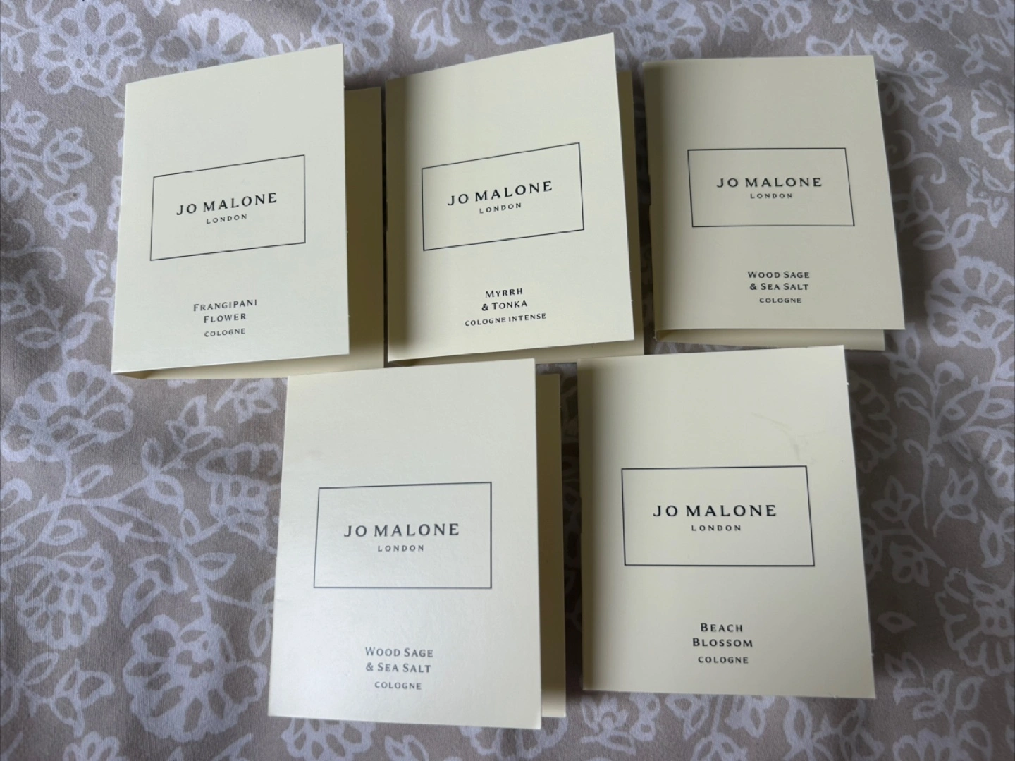 5 Jo Malone luxury perfume samples for $10 for the whole bundle! Includes x2 of the famous Wood Sage & Sea Salt, and 1 of each for Fragipani Flower, Beach Blossom (their newest release), and Myrrh & Tonka !