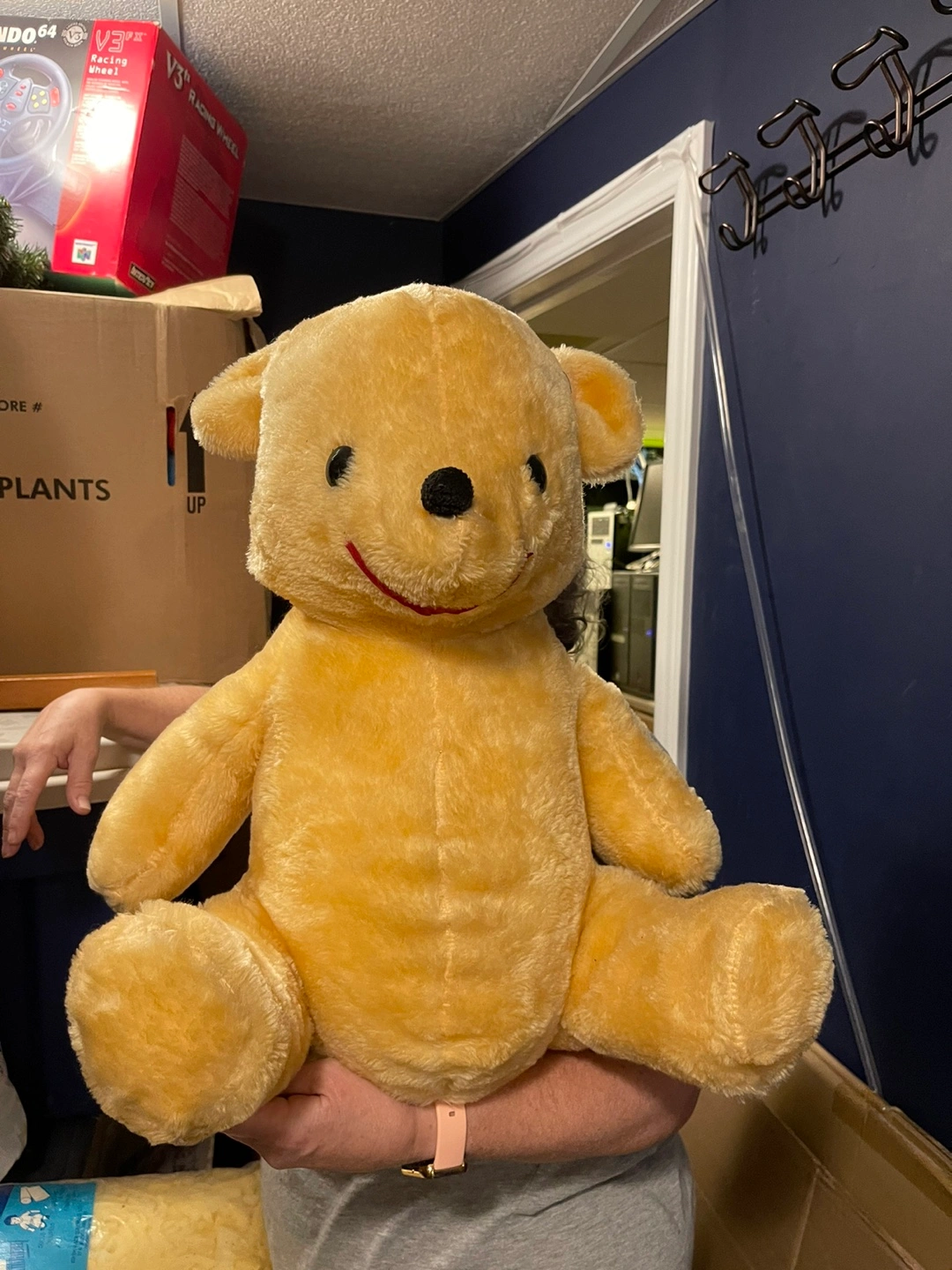Selling a vintage Winnie the Pooh plush toy! It's in good condition and ready for a new home. Very large! That is my sister behind there.