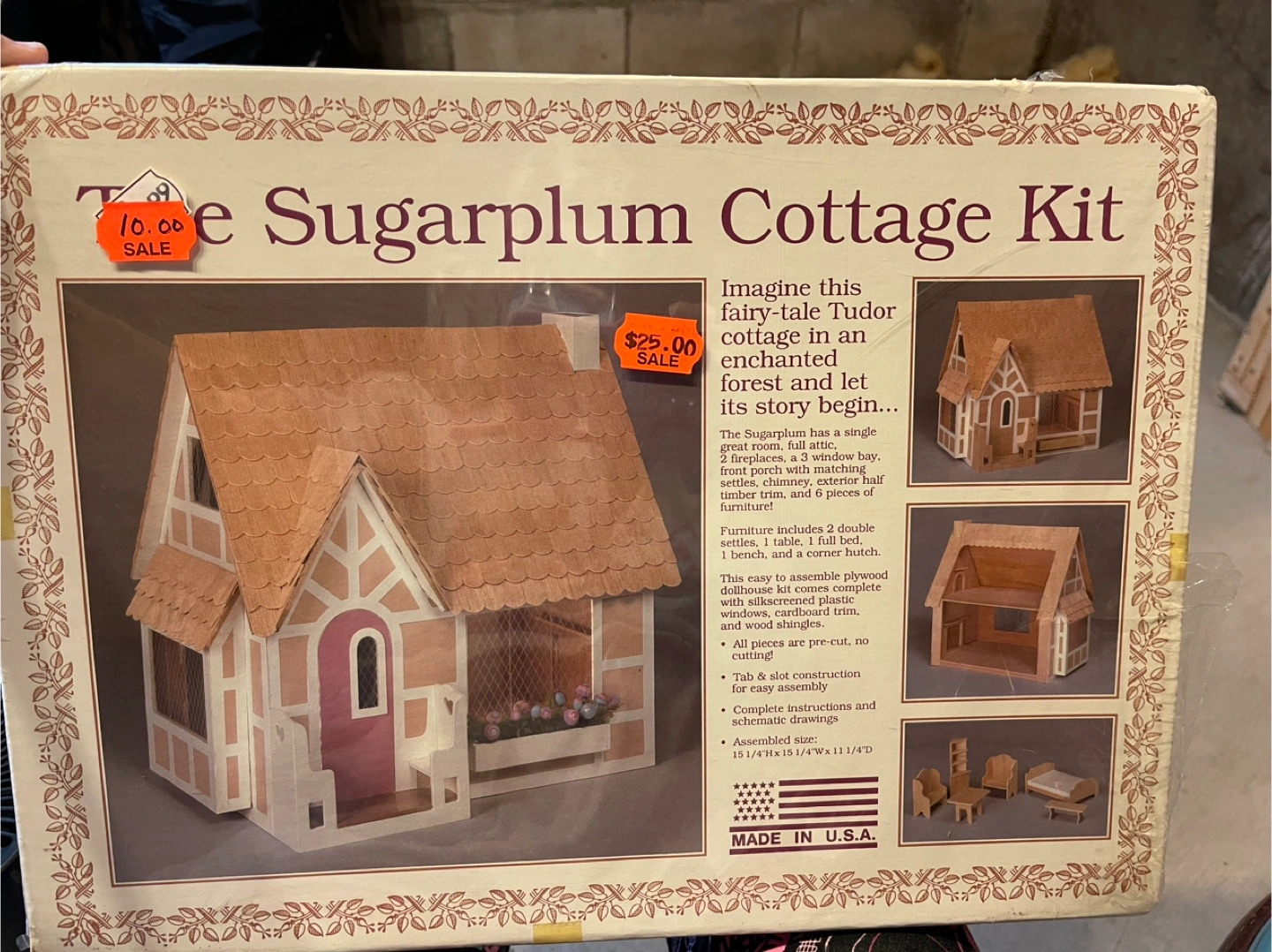 Selling The Sugarplum Cottage Kit! It's an easy to assemble plywood dollhouse kit that comes complete with silkscreened plastic windows, cardboard trim, and wood shingles. All pieces are pre-cut for easy assembly. It also includes complete instructions and schematic drawings. The assembled size is 15 1/4"H x 15 1/4 Wx 11 1/4"D