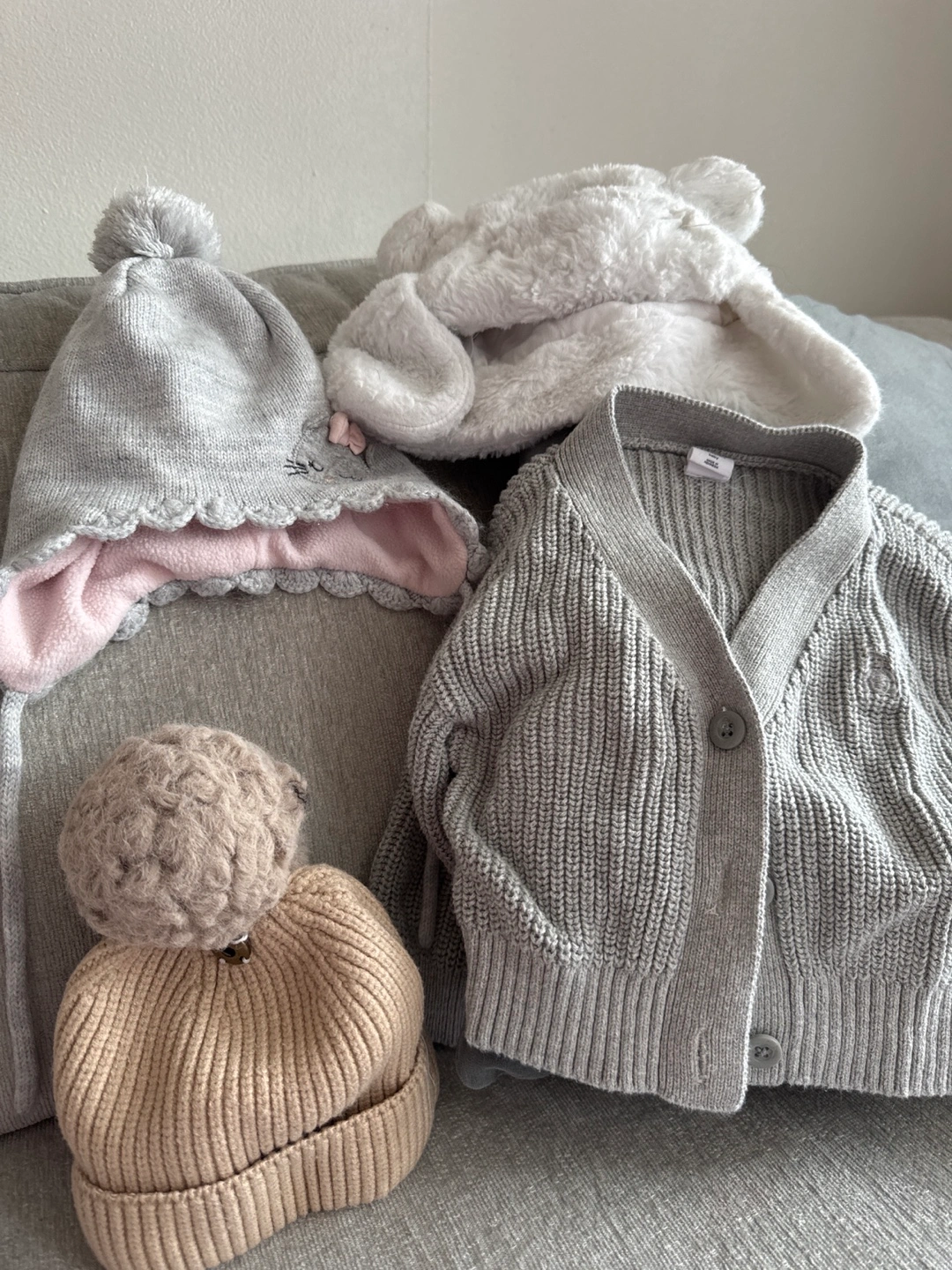 A cute bundle of baby clothes for 6-12 months! Includes a gray cardigan and three adorable hats.