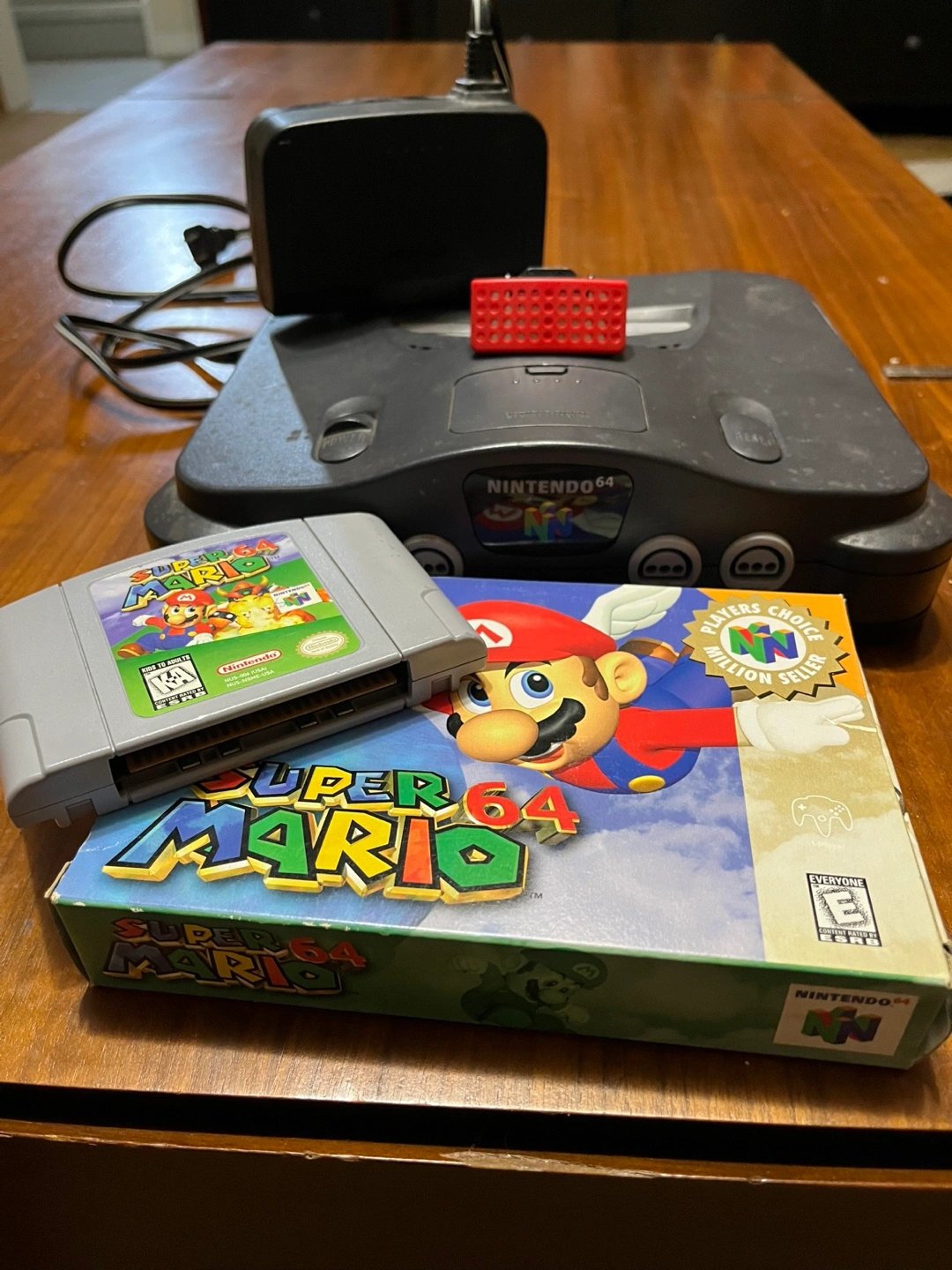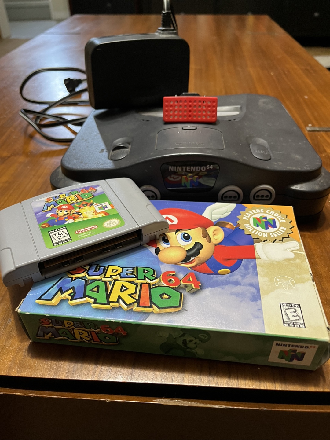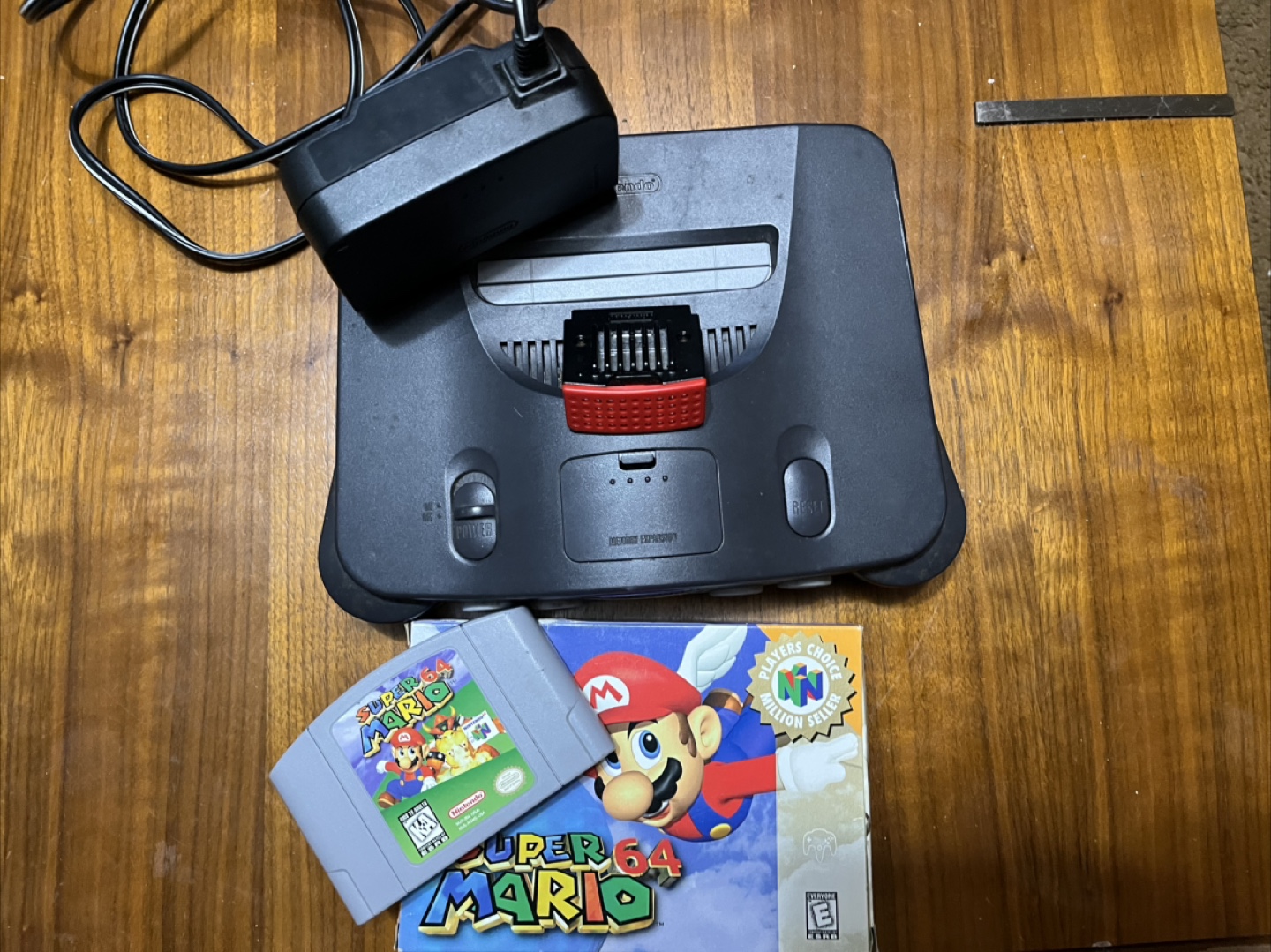 Nintendo 64 console with expansion pack and original power supply, along Super Mario 64 cartridge with original box.