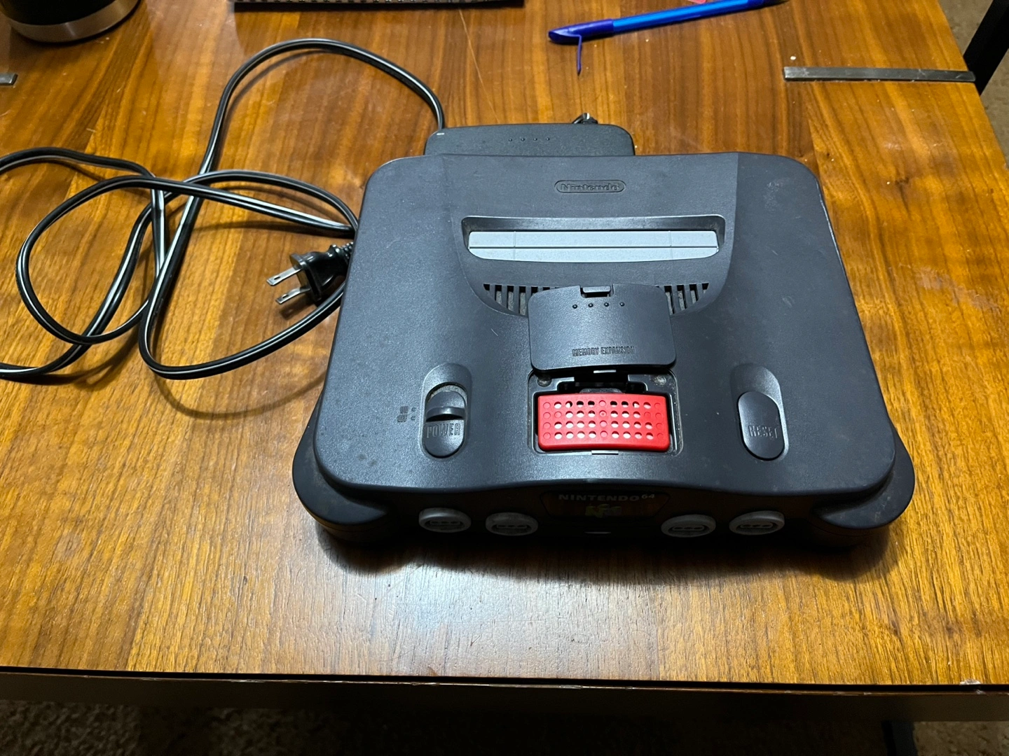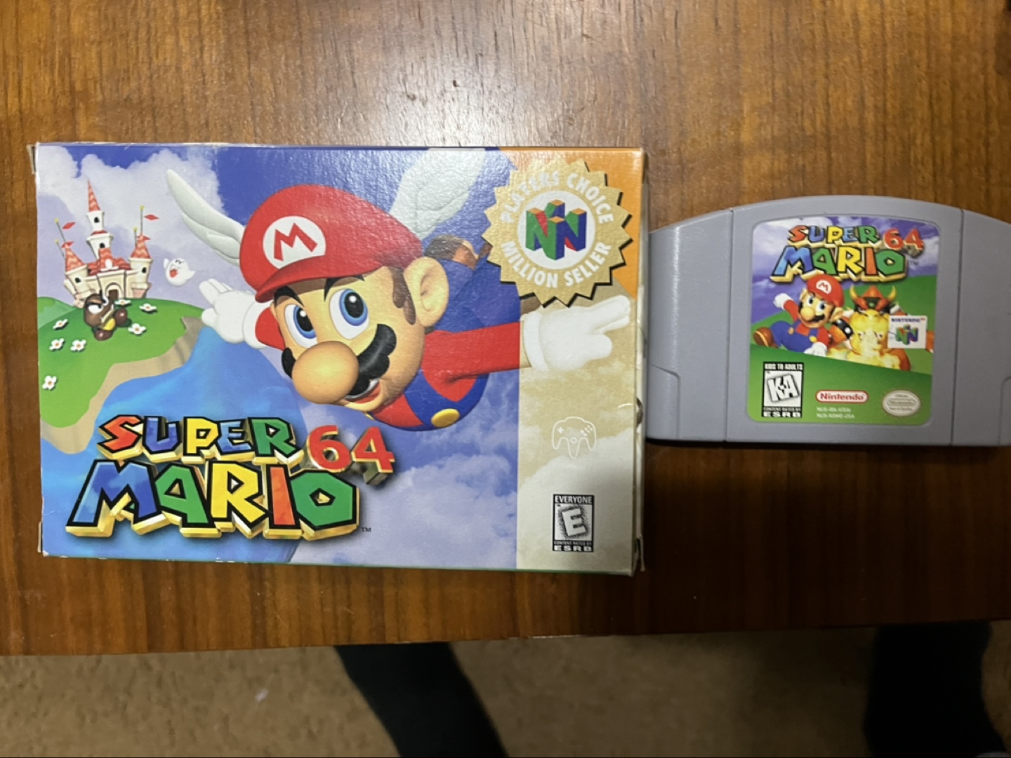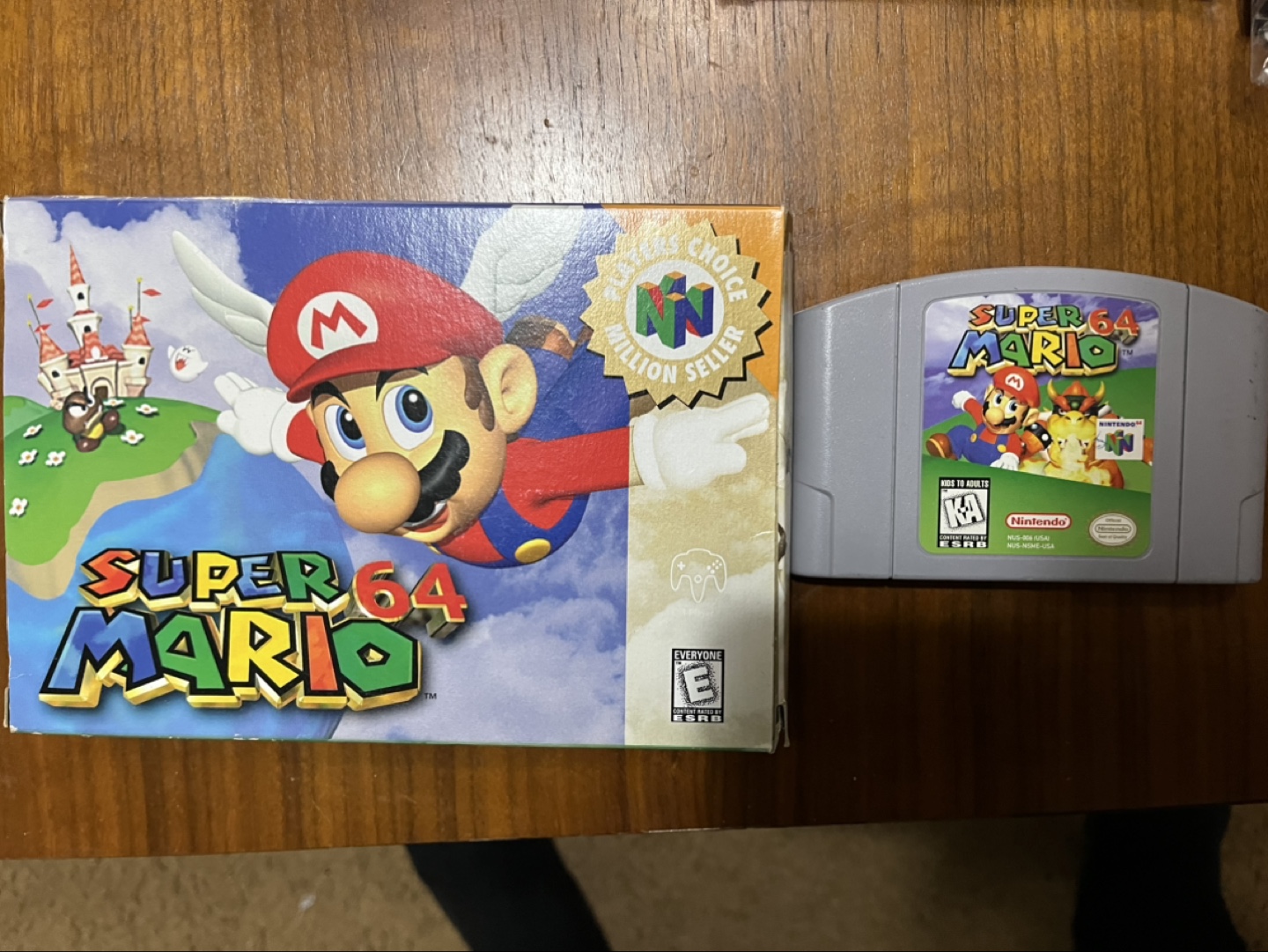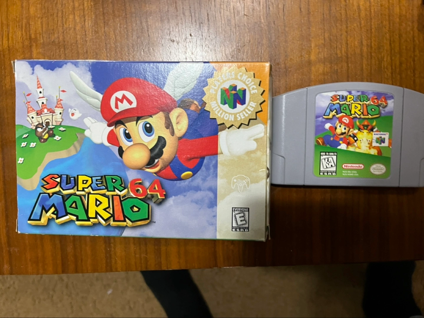 Nintendo 64 console with expansion pack and original power supply, along Super Mario 64 cartridge with original box.