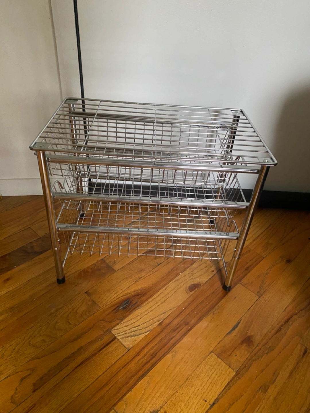 Selling a metal wire shelf rack. It has three tiers, great for storage or organization. It's in good condition and ready for a new home!