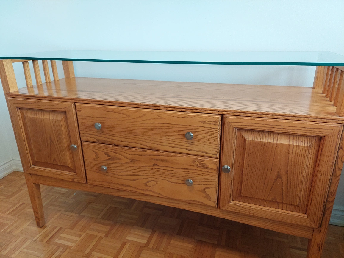 Selling a wooden cabinet featuring a sleek glass top. It has two drawers and two cabinet doors, offering ample storage space. The cabinet is in good condition and would be a great addition to any home! Drawers are on rollers and fabric lined. LAST WEEK TO GET THIS OR IT'S GONE!
