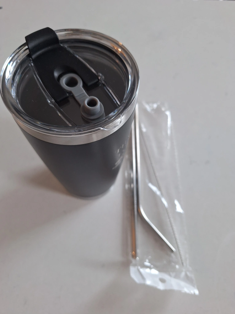 Selling a black tumbler that comes with a straw. It's in great condition and ready for a new home! Perfect for keeping your drinks hot or cold on the go