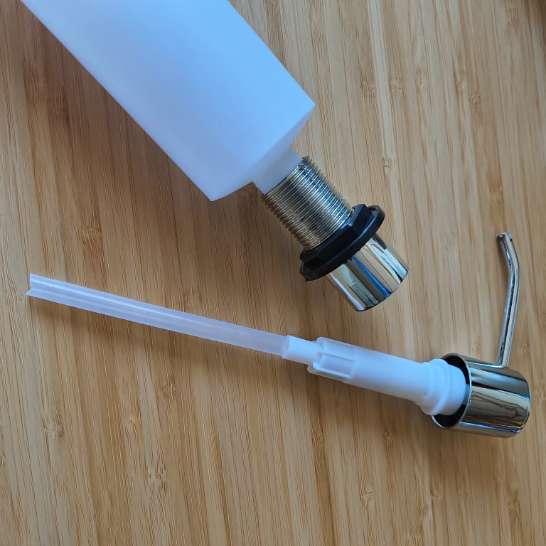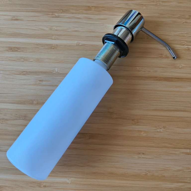 Chrome built-in countertop soap dispenser! It's in good condition and ready to use. Perfect for your kitchen or bathroom sink. Very easy to refill.