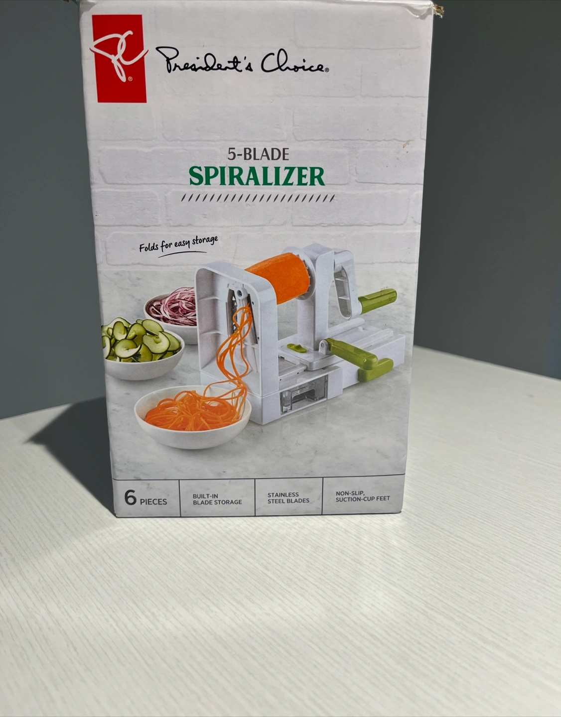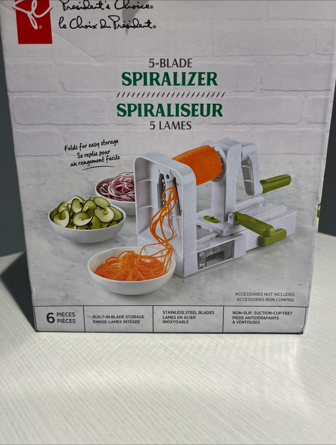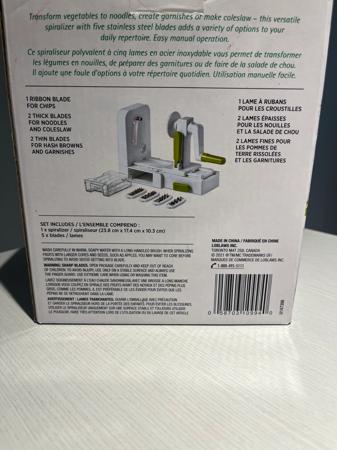 Transform veggies with this versatile spiralizer! It has five stainless steel blades and offers a variety of options for your daily repertoire. Easy manual operation. Comes with ribbon blade, thick blades for noodles and coleslaw, and thin blades for hash browns and garnishes. Includes spiralizer and 5 blades. The box is included
