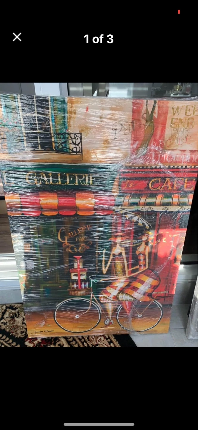 Selling a framed wall art piece featuring a Parisian cafe scene. It's a vibrant and eye-catching piece that would look great in any room. The artwork depicts 'Galerie le Cafe' with a bicycle and figures, bringing a touch of Parisian charm to your home. It's in good condition and ready to be hung up and enjoyed