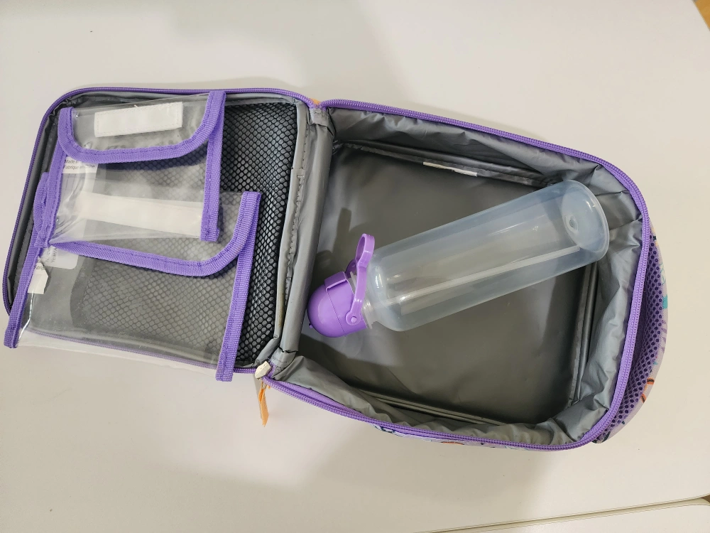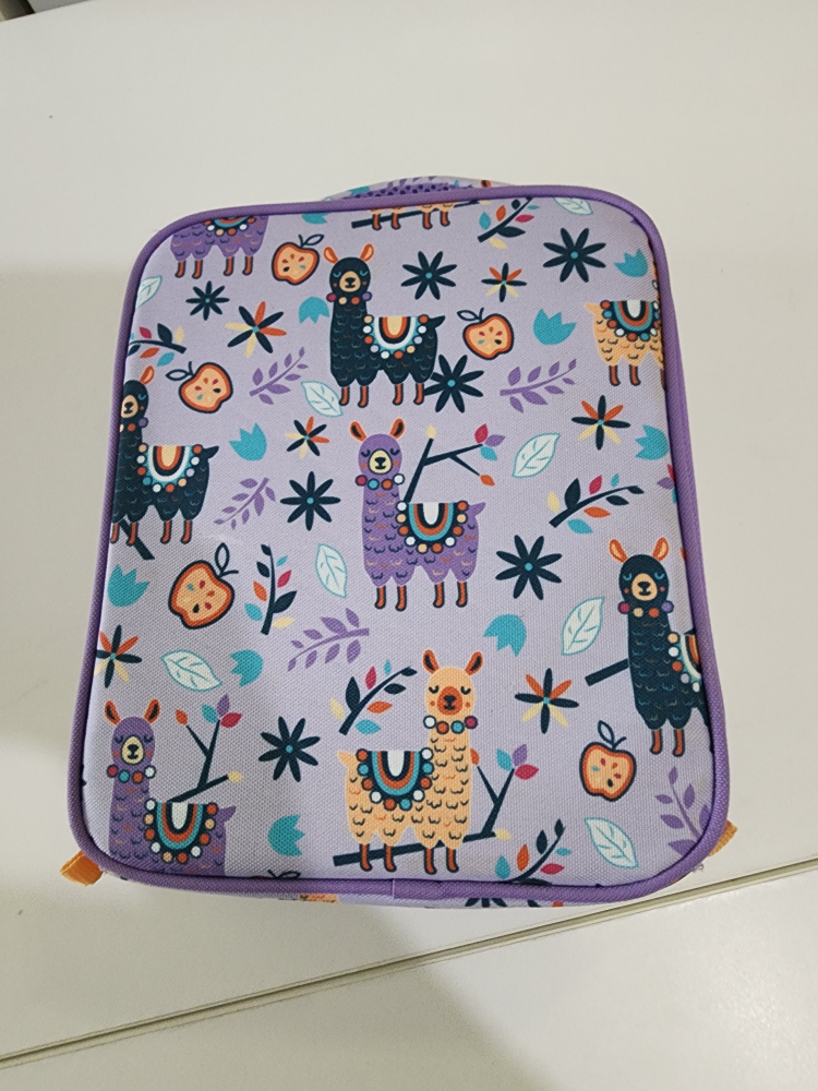 Cute llama print lunch box, perfect for kids! It comes with a matching water bottle and has plenty of room inside for snacks and lunch. The interior has a mesh pocket and a clear pocket for utensils or an ice pack. Great for school or picnics. Want to give back to kids who need supplies.