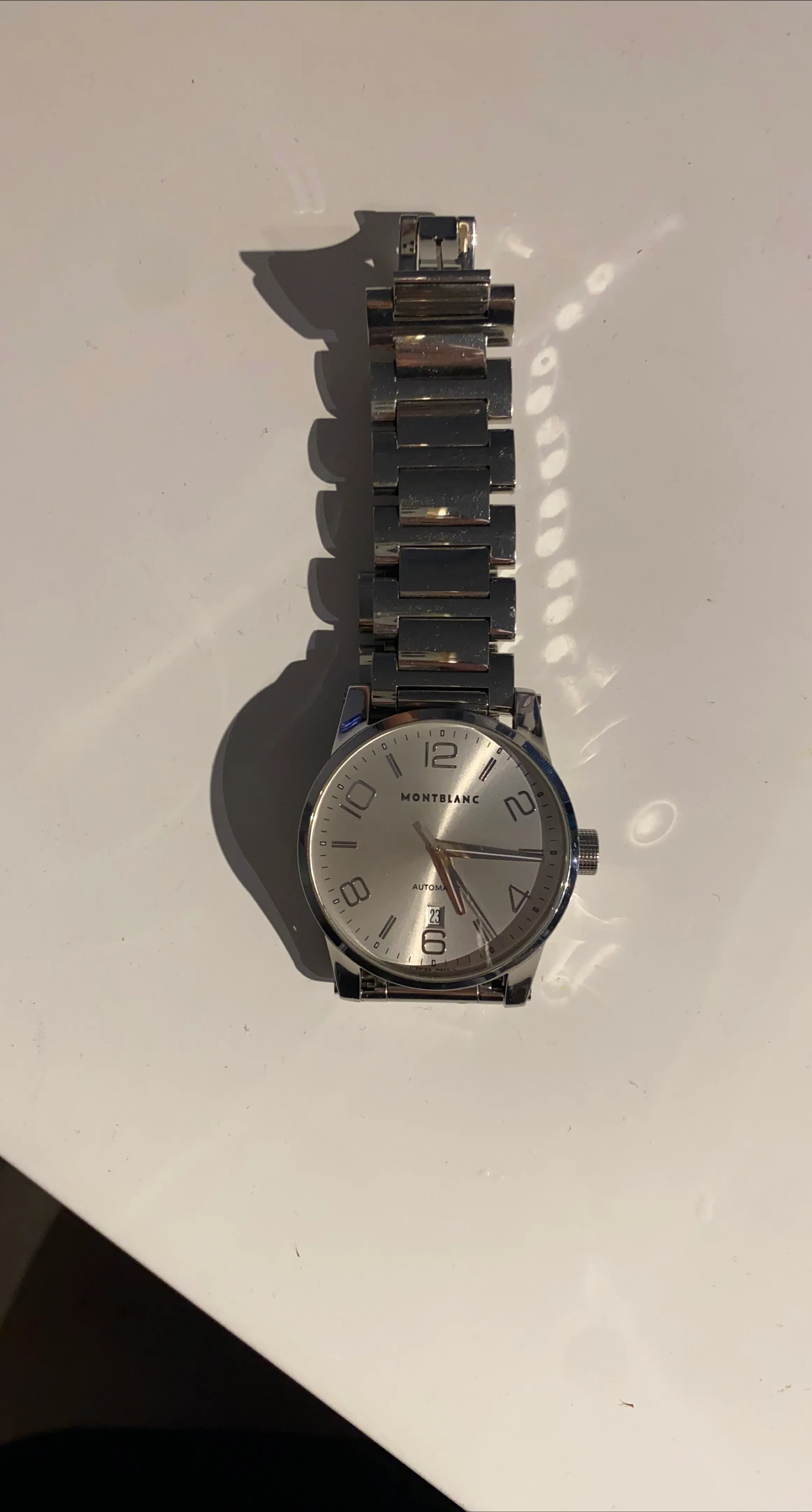 Selling a Montblanc automatic watch with a silver-tone finish. The watch features a date display at the 6 o'clock position and a stainless steel bracelet. It's in great condition and ready for a new owner!