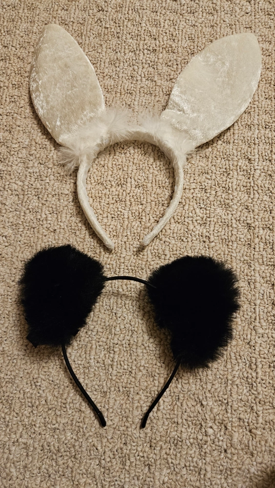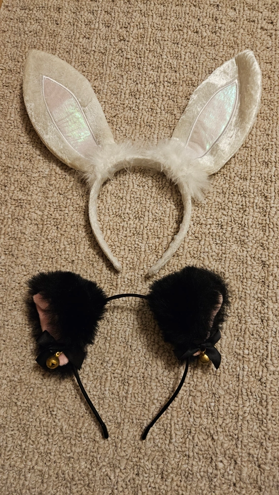 Selling a set of adorable bunny and cat ear headbands! Perfect for costumes or just adding a bit of fun to your day. The bunny ears are white and fluffy, while the cat ears are black with little bells.