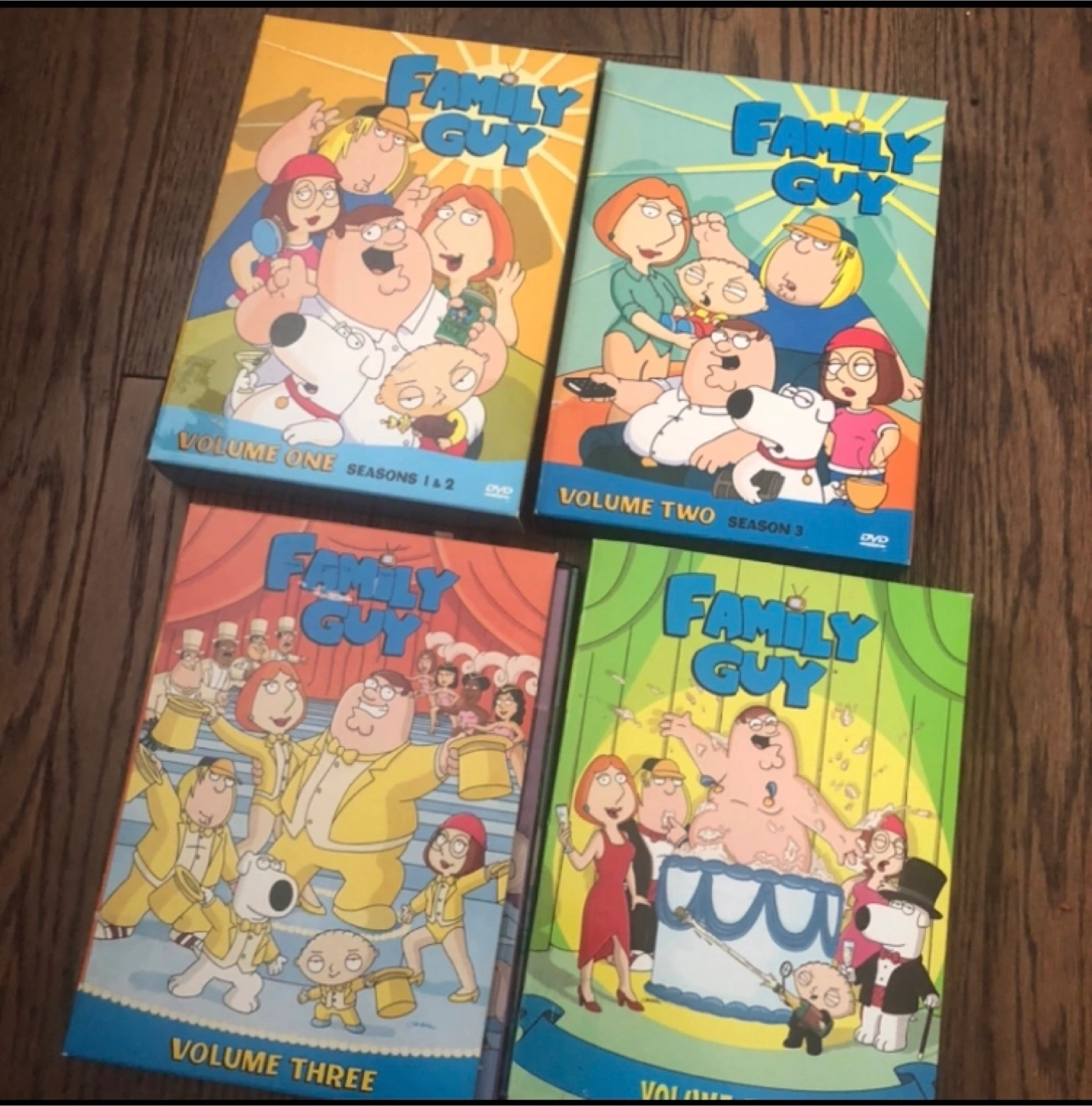 Selling a Family Guy DVD set including volumes 1, 2, 3, and 4! Volume One contains seasons 1 & 2, Volume Two contains season 3.