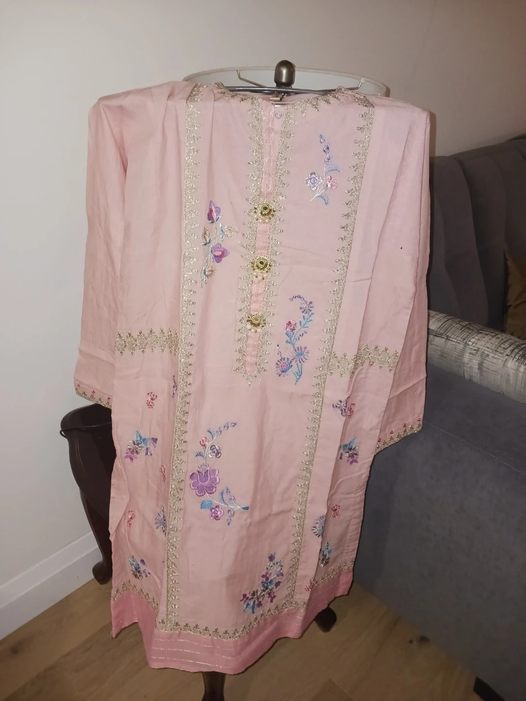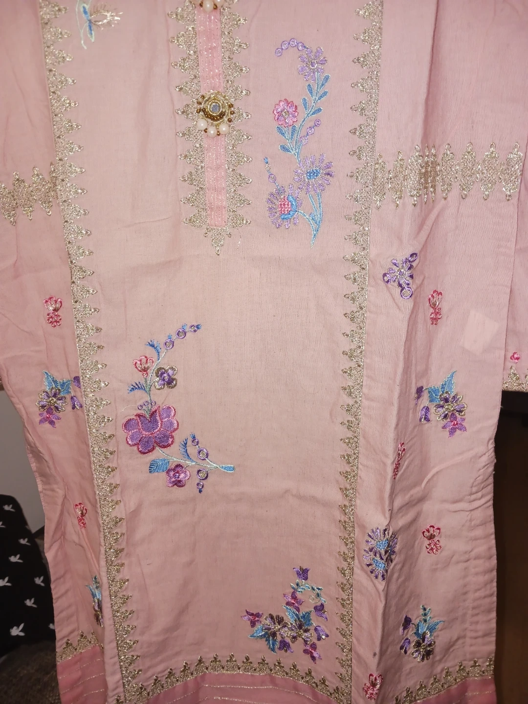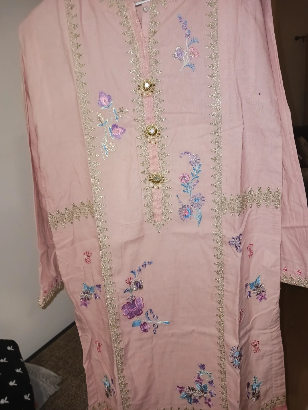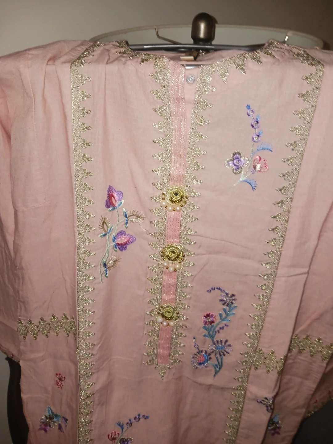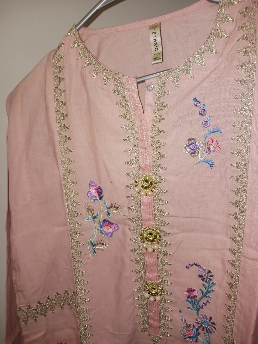 Lovely pink kurti from Ethnic, featuring delicate floral embroidery along the neckline and hem. It has gold and pearl button detailing down the front. This kurti's style is perfect for casual outings or dressing up for occasions.