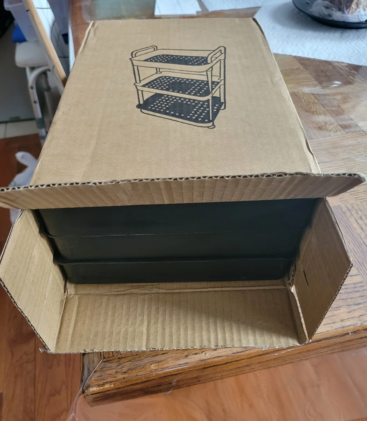 This is a black 3-tier rolling cart. It's made of plastic and includes wheels for easy movement. The shelves have a perforated design. It's useful for organizing items in tight spaces. New, never used