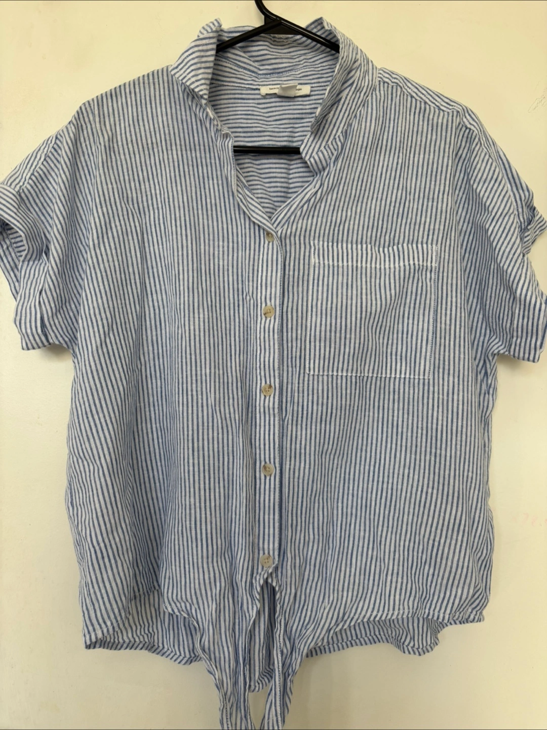 Selling a cute Beach Lunch Lounge shirt with a blue and white stripe pattern. It has a tie at the bottom and a pocket on the chest. Perfect for a casual summer look!