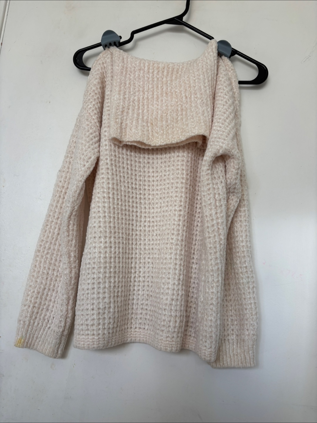 Cozy beige knit sweater with an off-the-shoulder design. It's in good condition, perfect for layering or wearing on its own for a relaxed, stylish look.