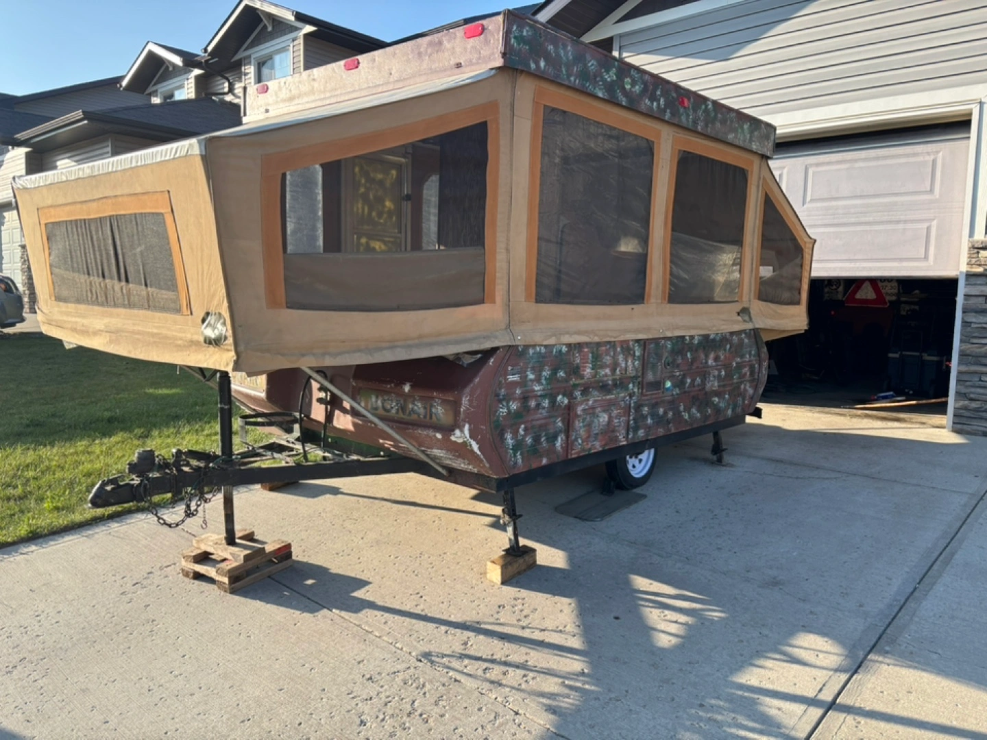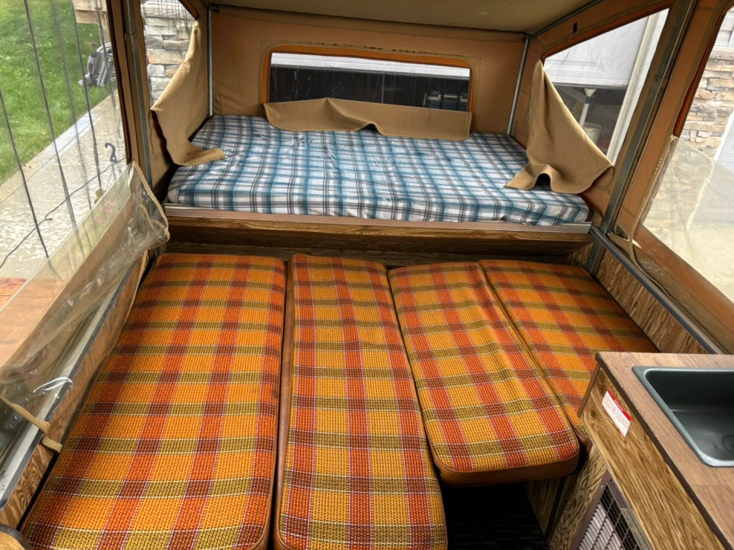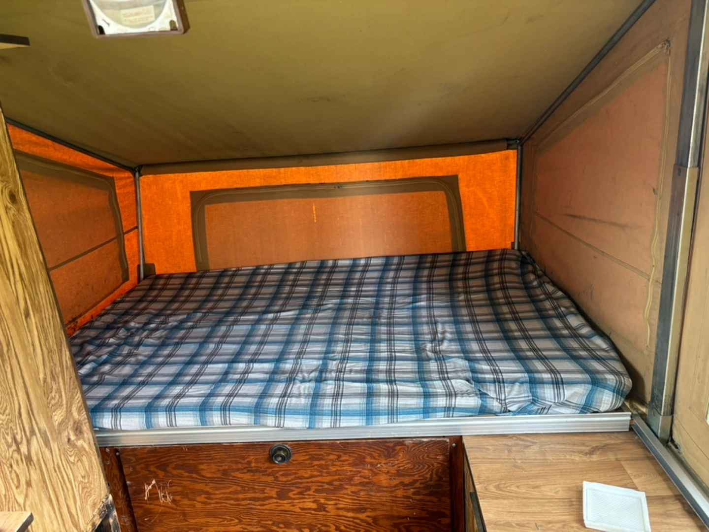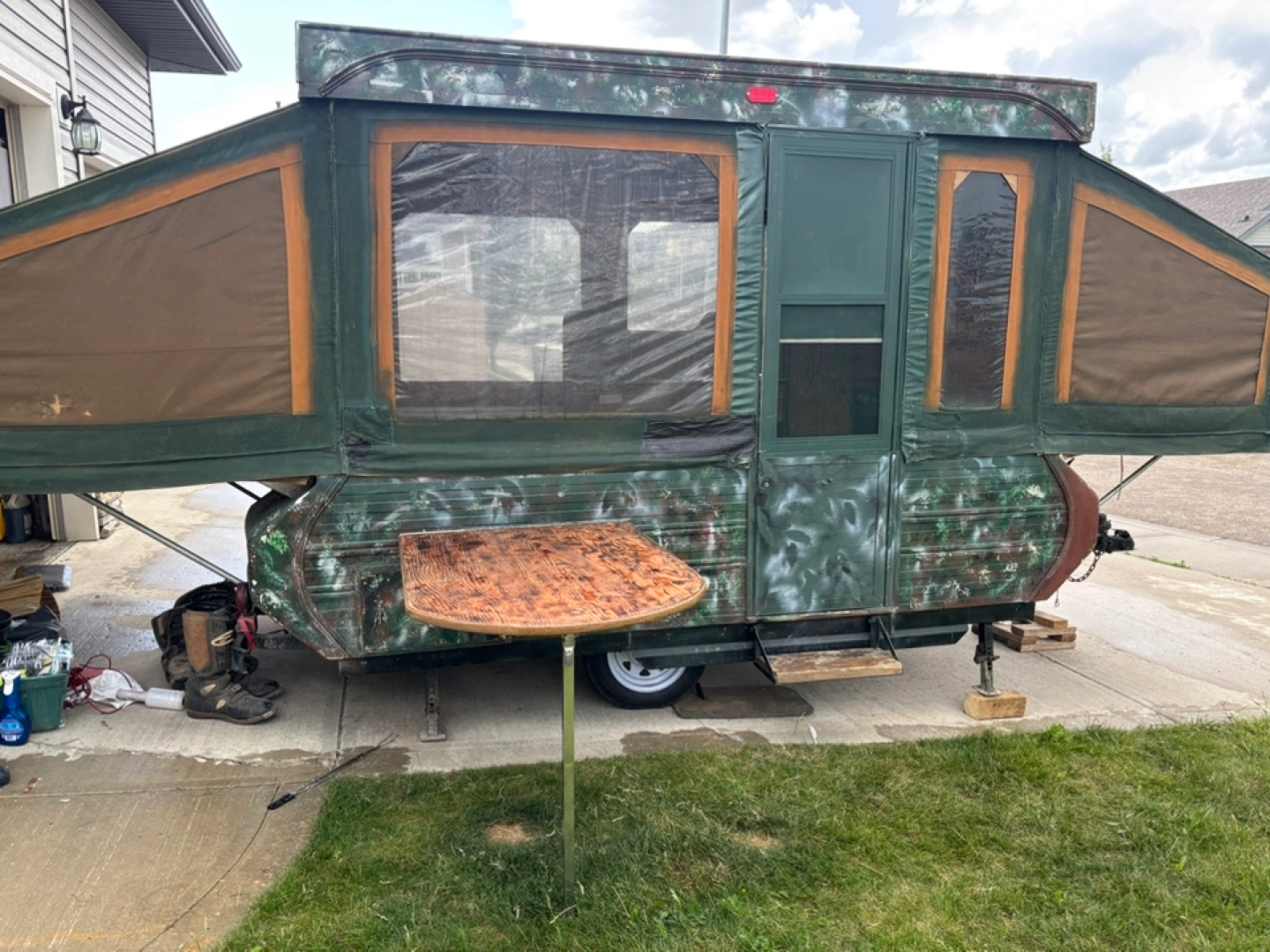 Selling a pop-up camper, perfect for camping trips! It has a camouflage pattern and a cozy interior with a bed. It's ready for your next outdoor adventure