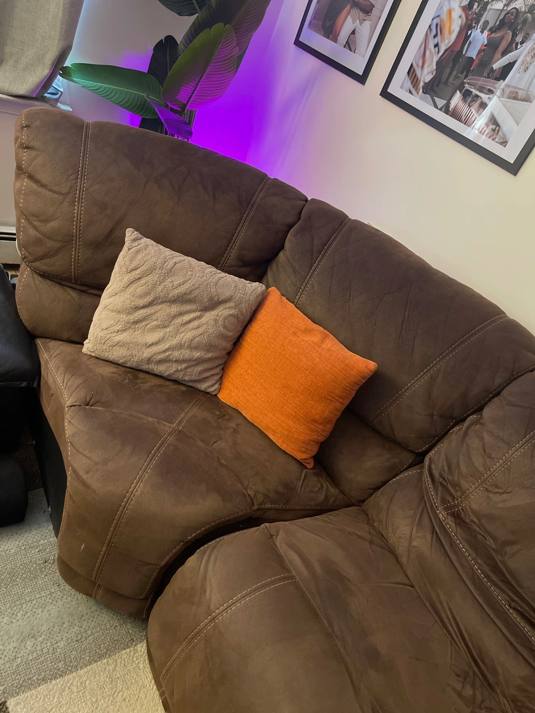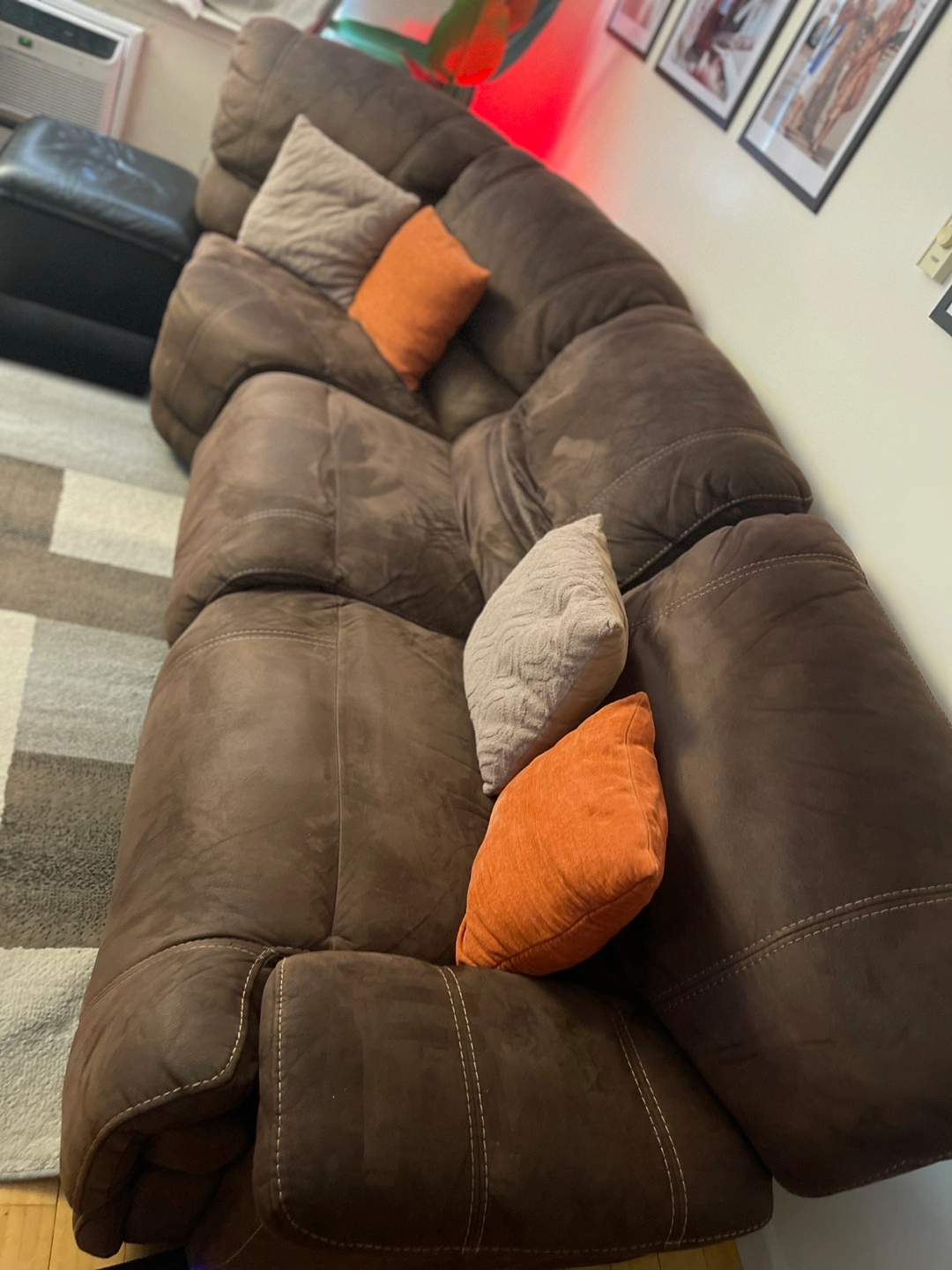 Comfortable dark brown couch with two recliners. Durable and sturdy, with plenty of cushioning. Ideal for living rooms, family rooms, or dens. In great condition, ready for its new home! This couch has been well loved in our home for 3 years and is now looking for its next cozy spot.