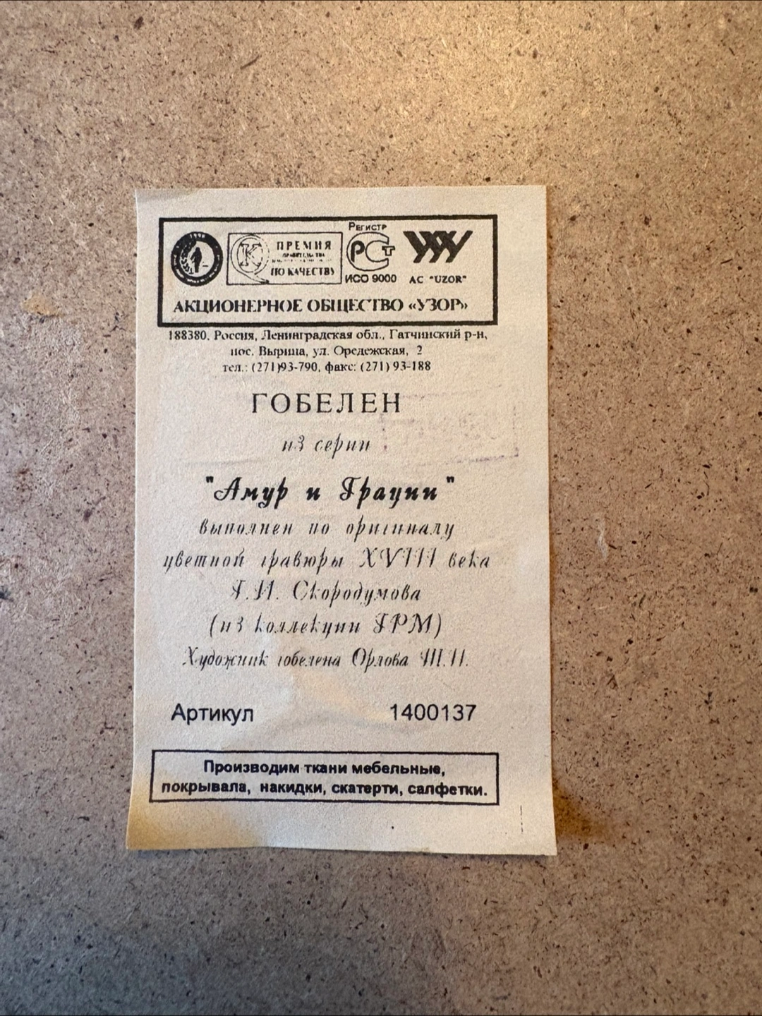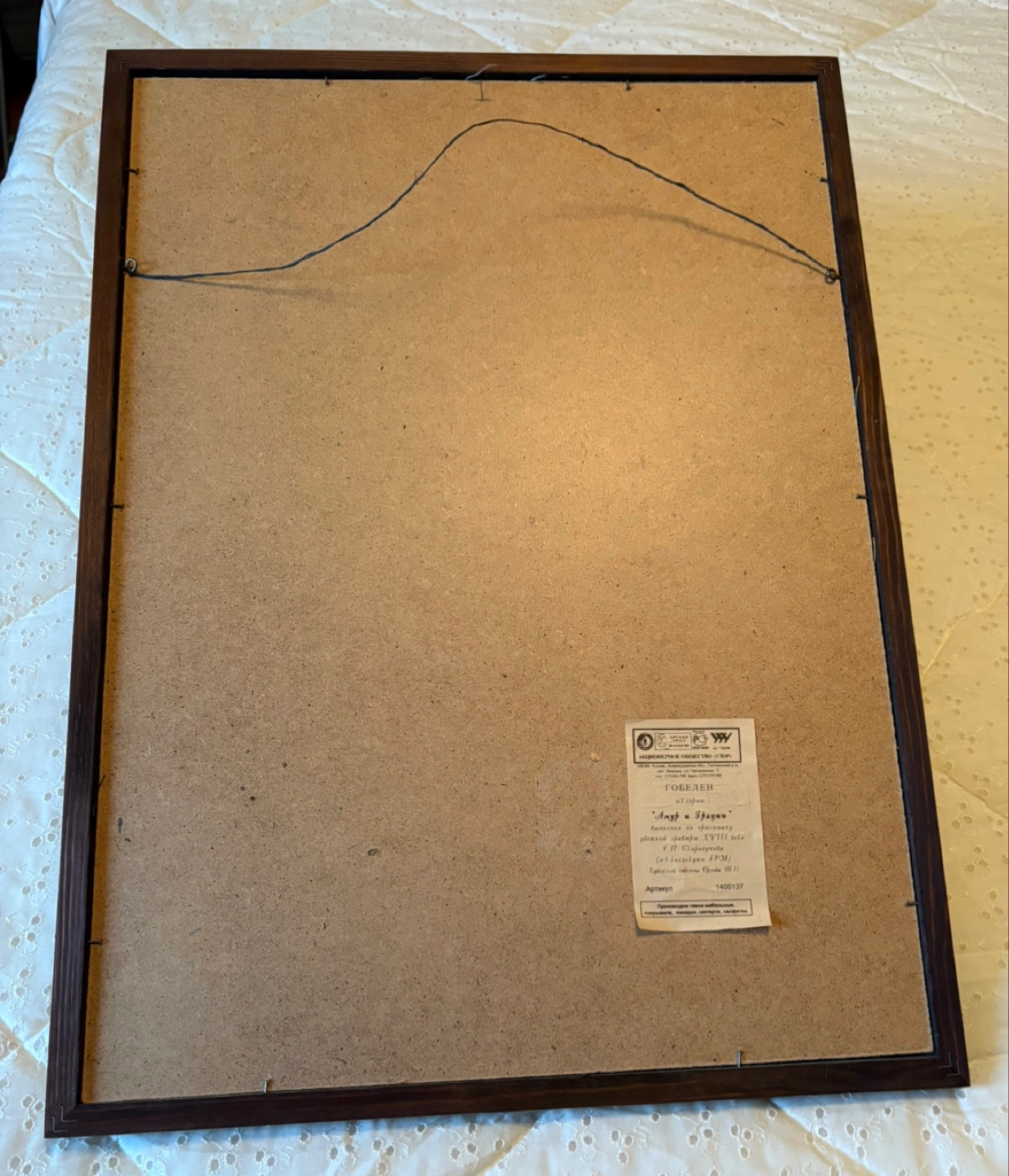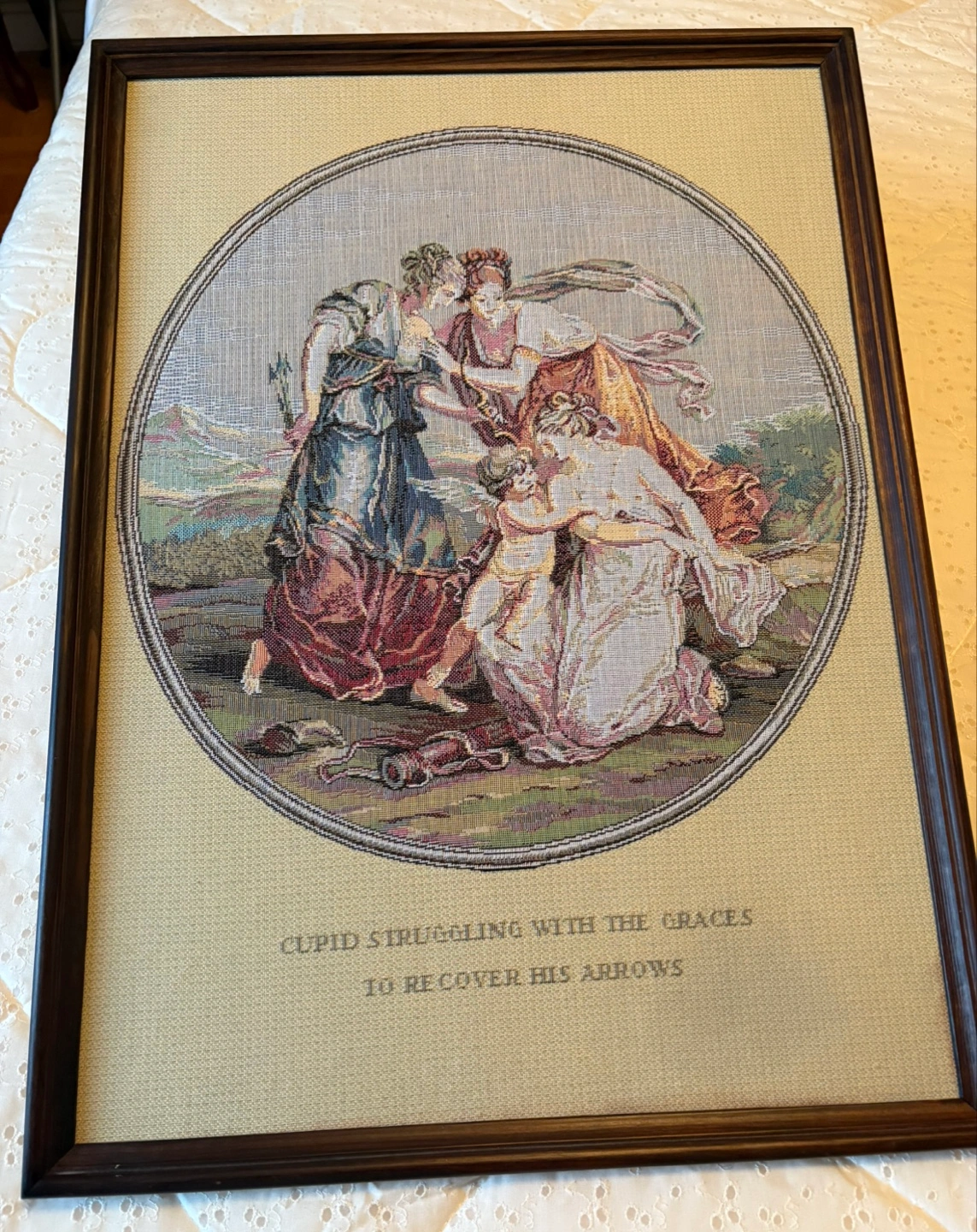 Selling a framed tapestry depicting "Cupid Struggling with the Graces to Recover His Arrows"! It's a beautiful piece with a classical theme, perfect for adding a touch of elegance to any room