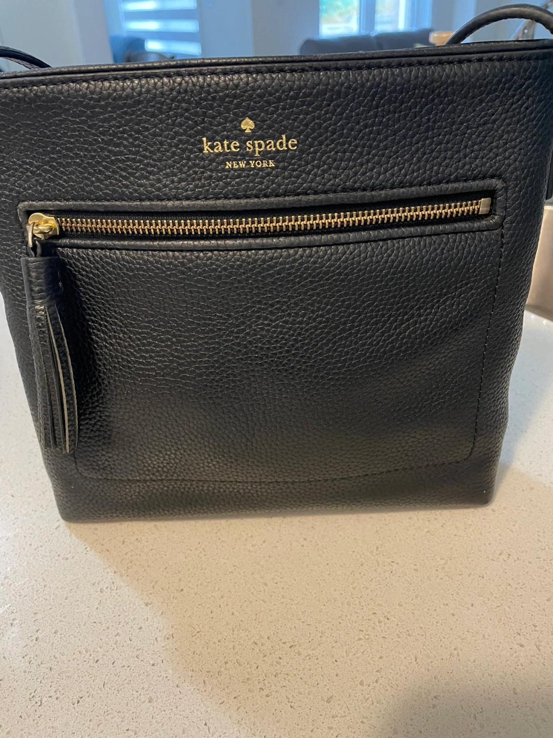 Kate Spade crossbody bag. Color Black with gold zipper. Adjustable strap, all zips work no rips inside lining see photos. Clean smoke free home. Pick up in Clarington