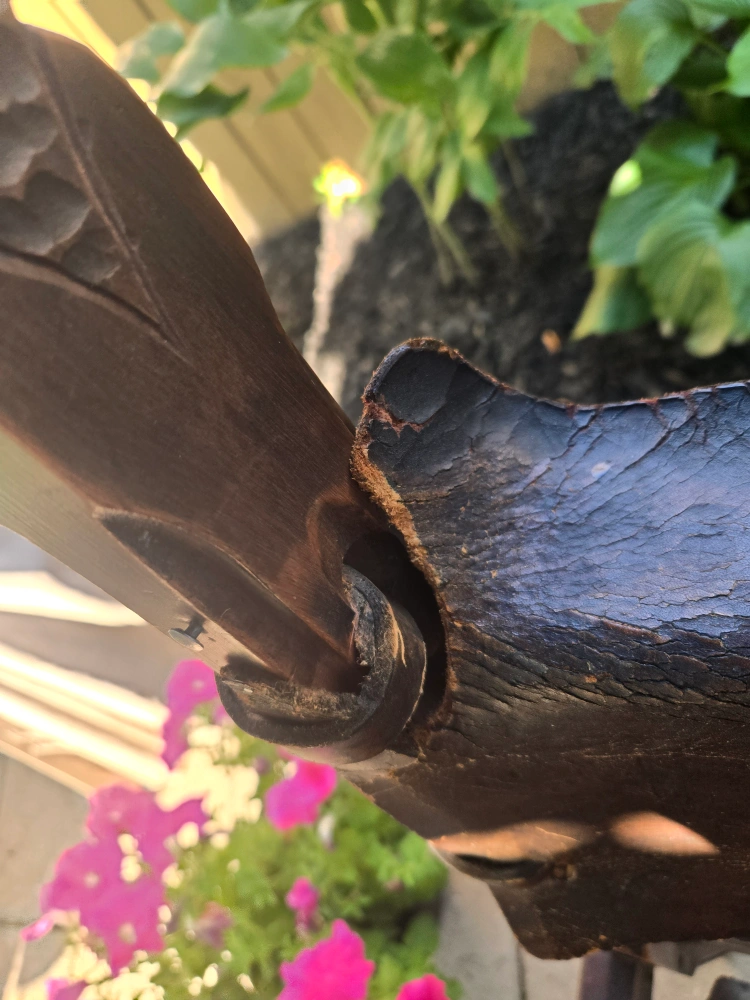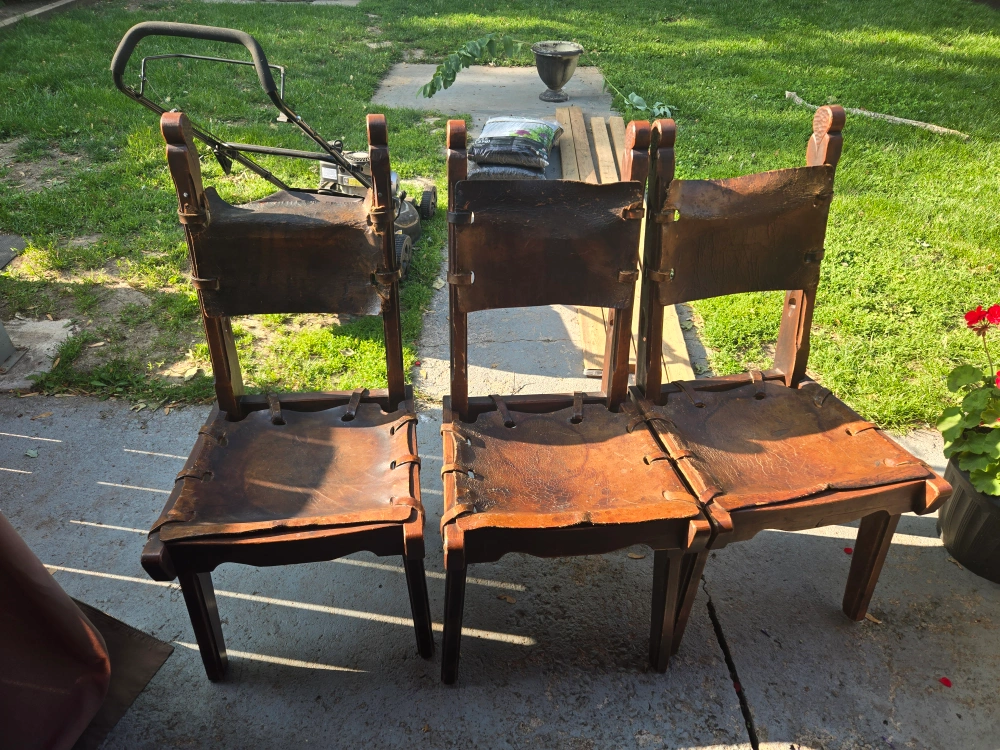 Selling a set of rustic dining chairs. They feature a unique design with leather seats and backs attached to a wooden frame. These chairs would add a touch of vintage charm to any dining space. They show some wear, which adds to their character!