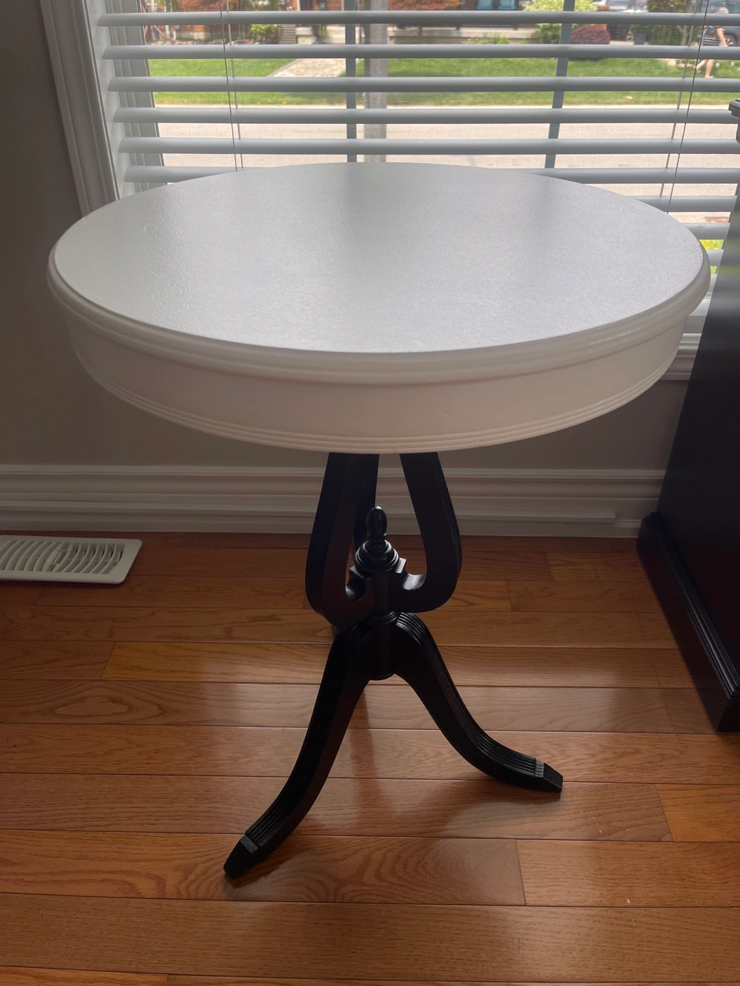 Selling a cute round accent table! It features a white top and a dark wood base with a unique pedestal design. It would make a great addition to any living room or bedroom