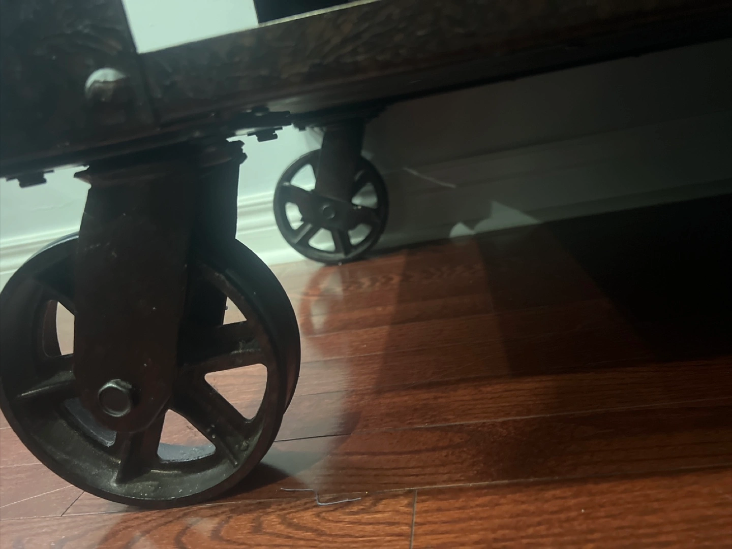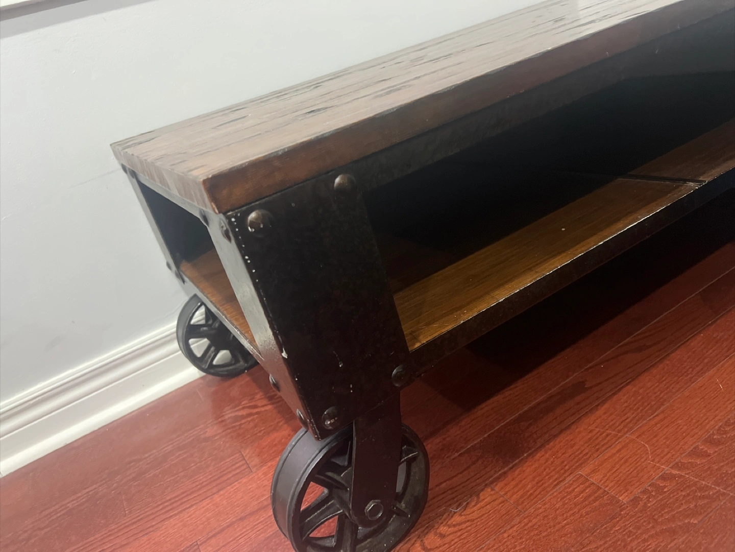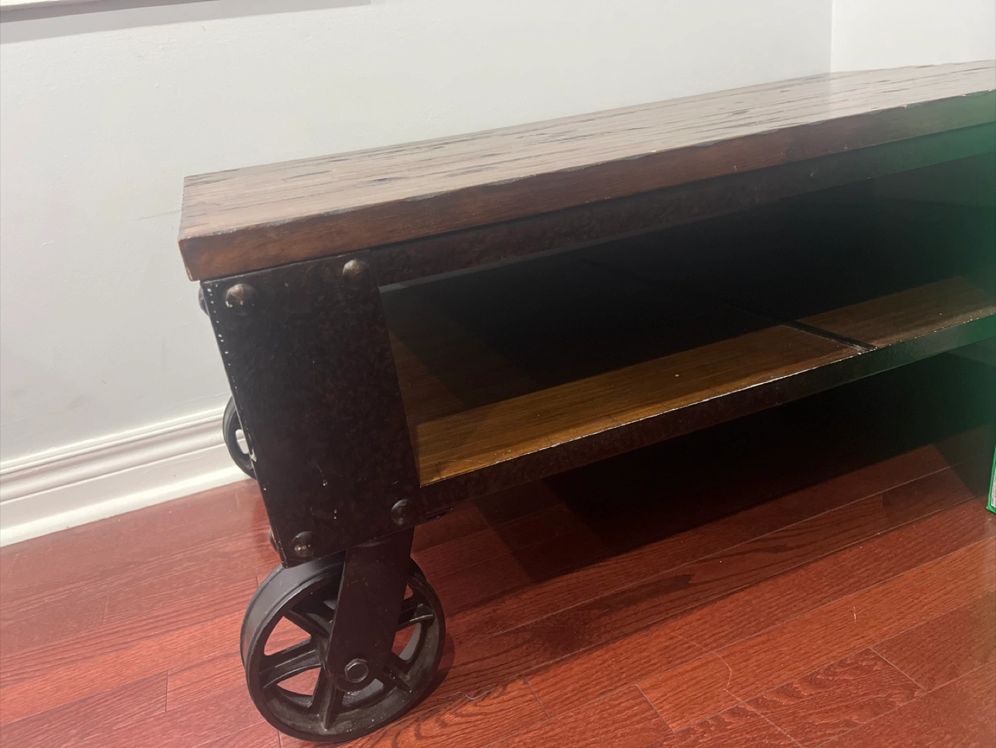 Coffee table. It features a wooden top and shelf with a dark metal frame and wheels. It's in good condition and would be a great addition to any living room! Extreme good quality wood used. Textured hard wood rough design on the top