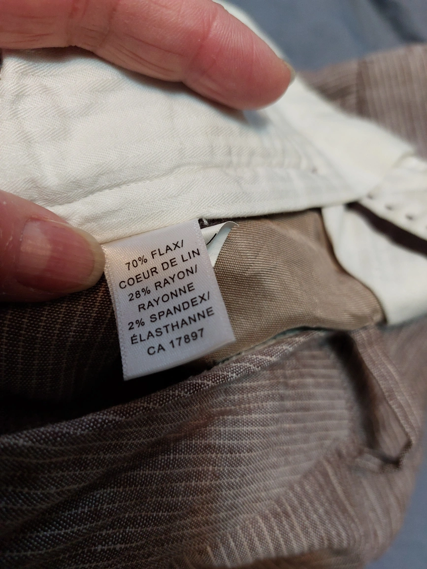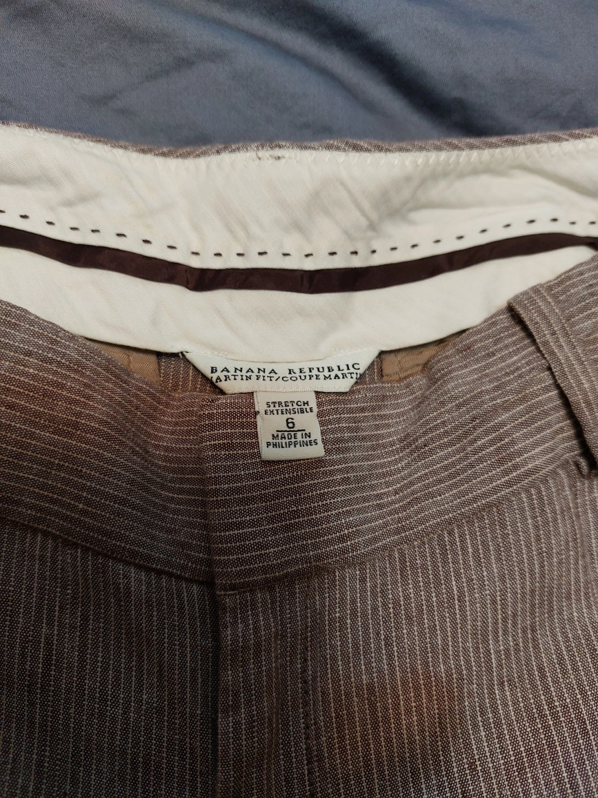 Selling a pair of Banana Republic linen blend pants in size 6. These are the Artist/Coeur Martin style and are made of 70% flax/coeur de lin, 28% rayon/rayonne, and 2% spandex/elastane. Very light fabric, great for summer. They're in great condition and ready for a new home! Inseam 32.