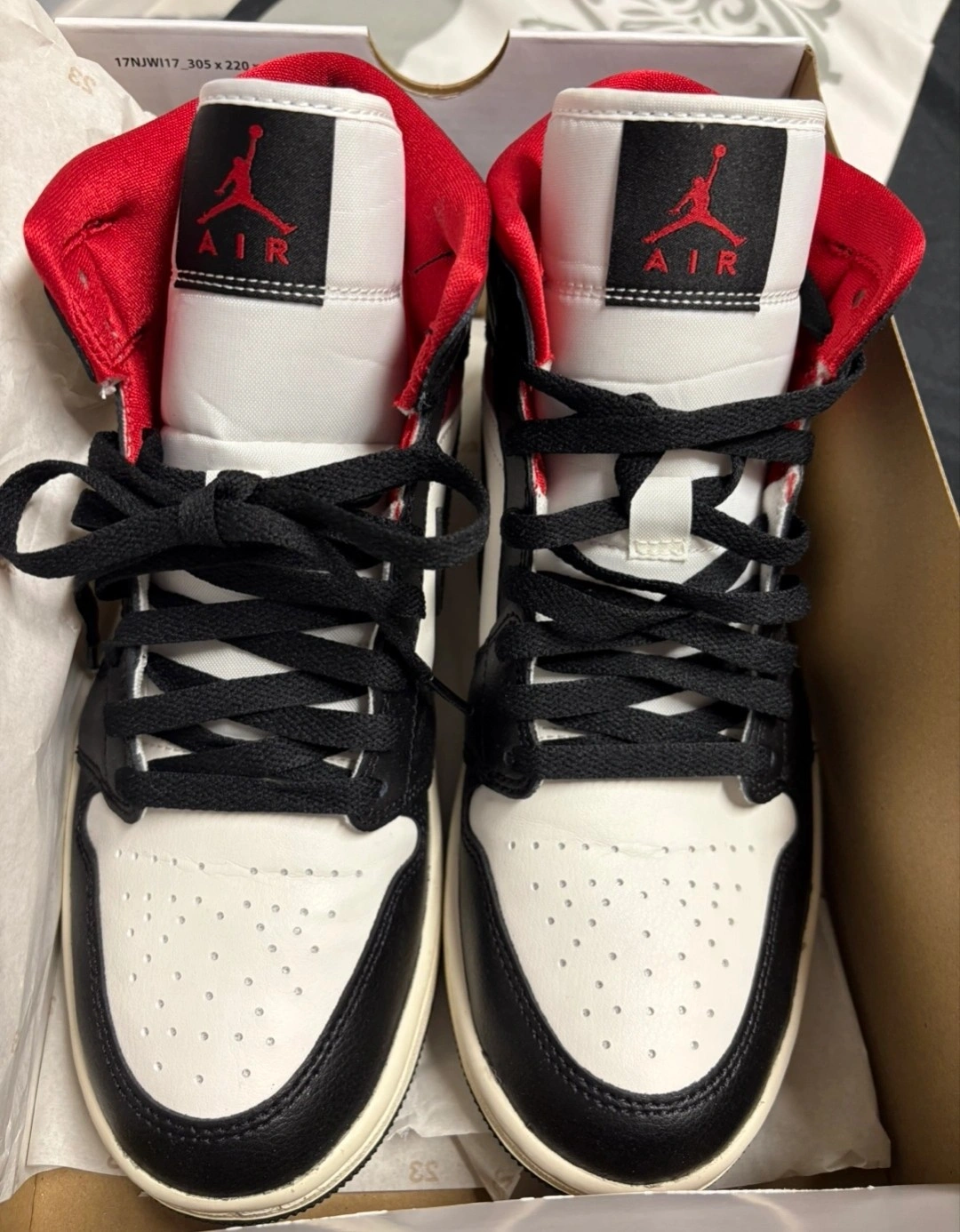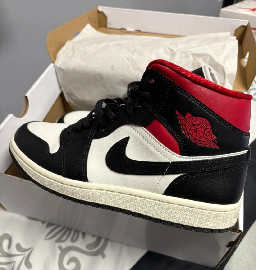 Selling a pair of Nike Air Jordan 1 Mid sneakers in US size 9.5. They come in a stylish black, white, and red colourway and are in great shape. The original box is included!