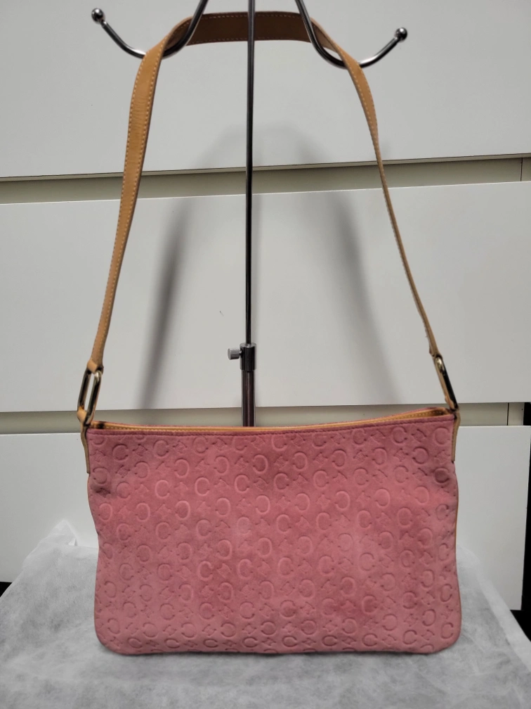 Pre-owned Celine shoulder bag. Pink suede material with tan leather accents. Features a long shoulder strap and subtle embossed logo. Excellent for everyday use. -made in Italy -authentic - minor rubs on the side - interior in perfect condition 11.2" L x 7.3" W x 1.2" please review pictures carefully.