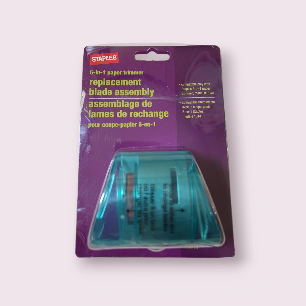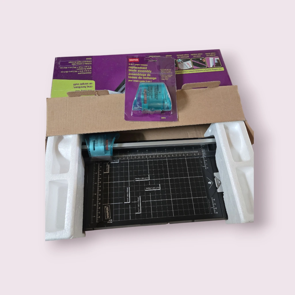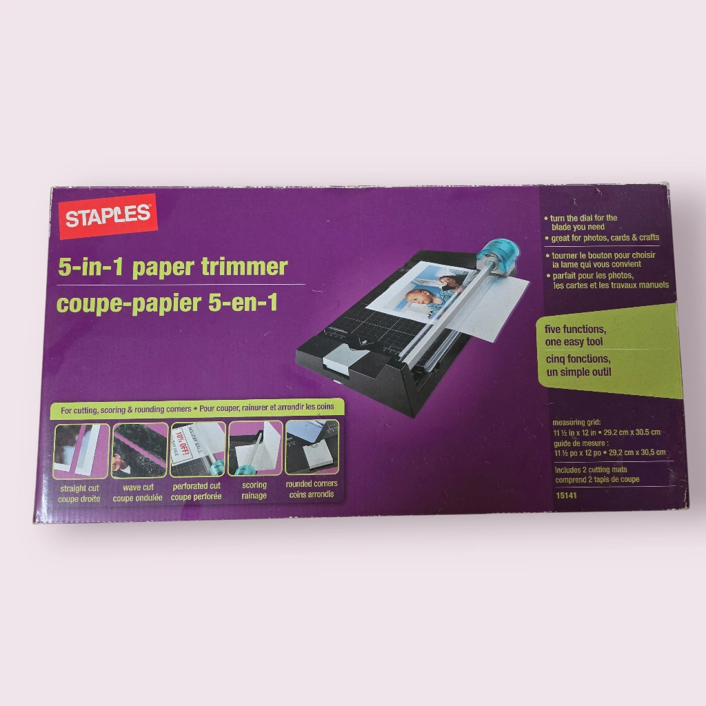 Selling a Staples 5-in-1 paper trimmer! It's great for photos, cards, and crafts. It can cut straight, wave cut, perforated cut, and rounded corners. The measuring grid is 11 1/2 in x 12 in / 29.2 cm x 30.5 cm. It includes replacement blade assembly.
