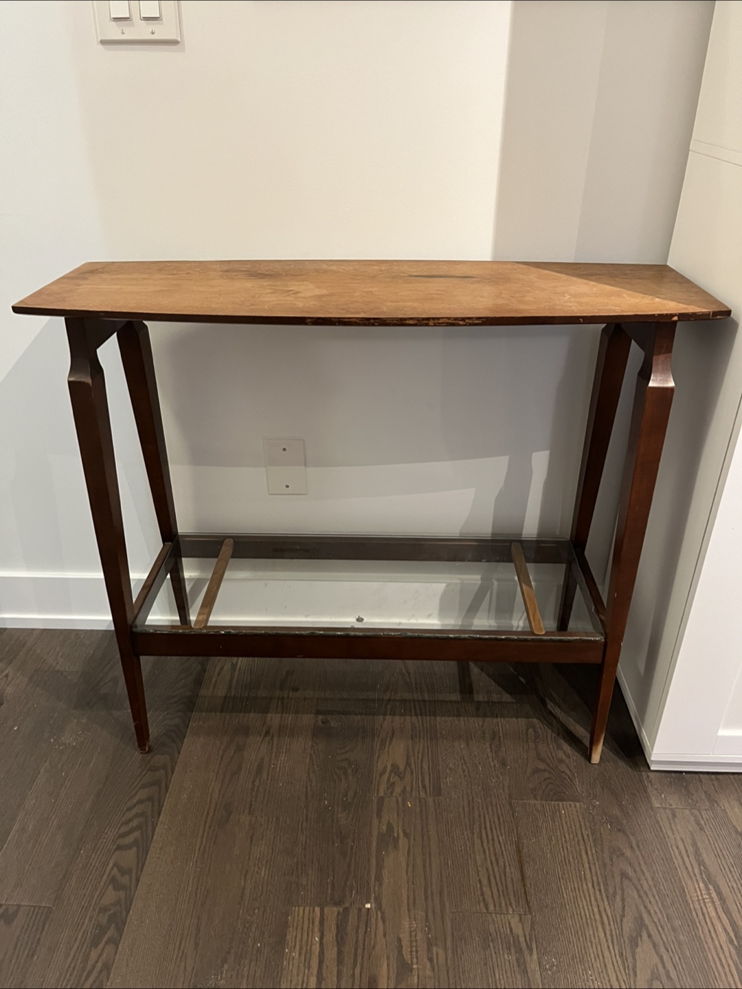 Vintage console table with a wood frame and glass shelf. It works great as an entryway table or can be used as a tv stand. It is narrow so works great in small spaces.