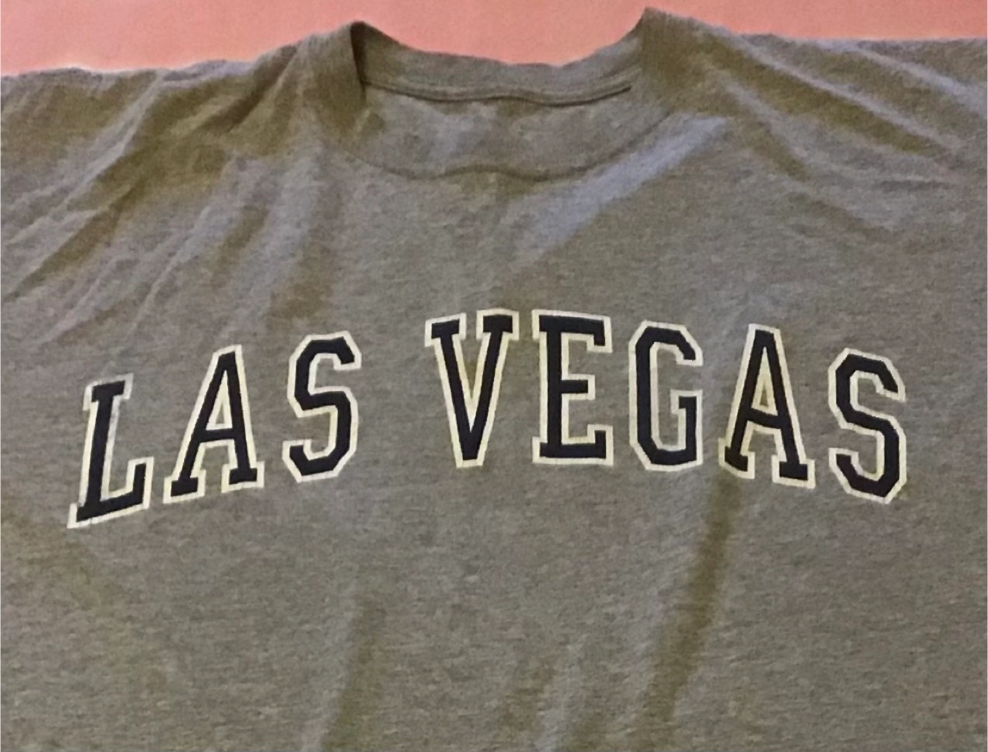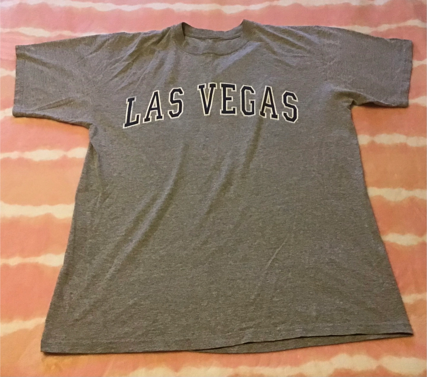 Here's a grey t-shirt with 'Las Vegas' printed on the front! It's in great condition and ready for a new home 🤩