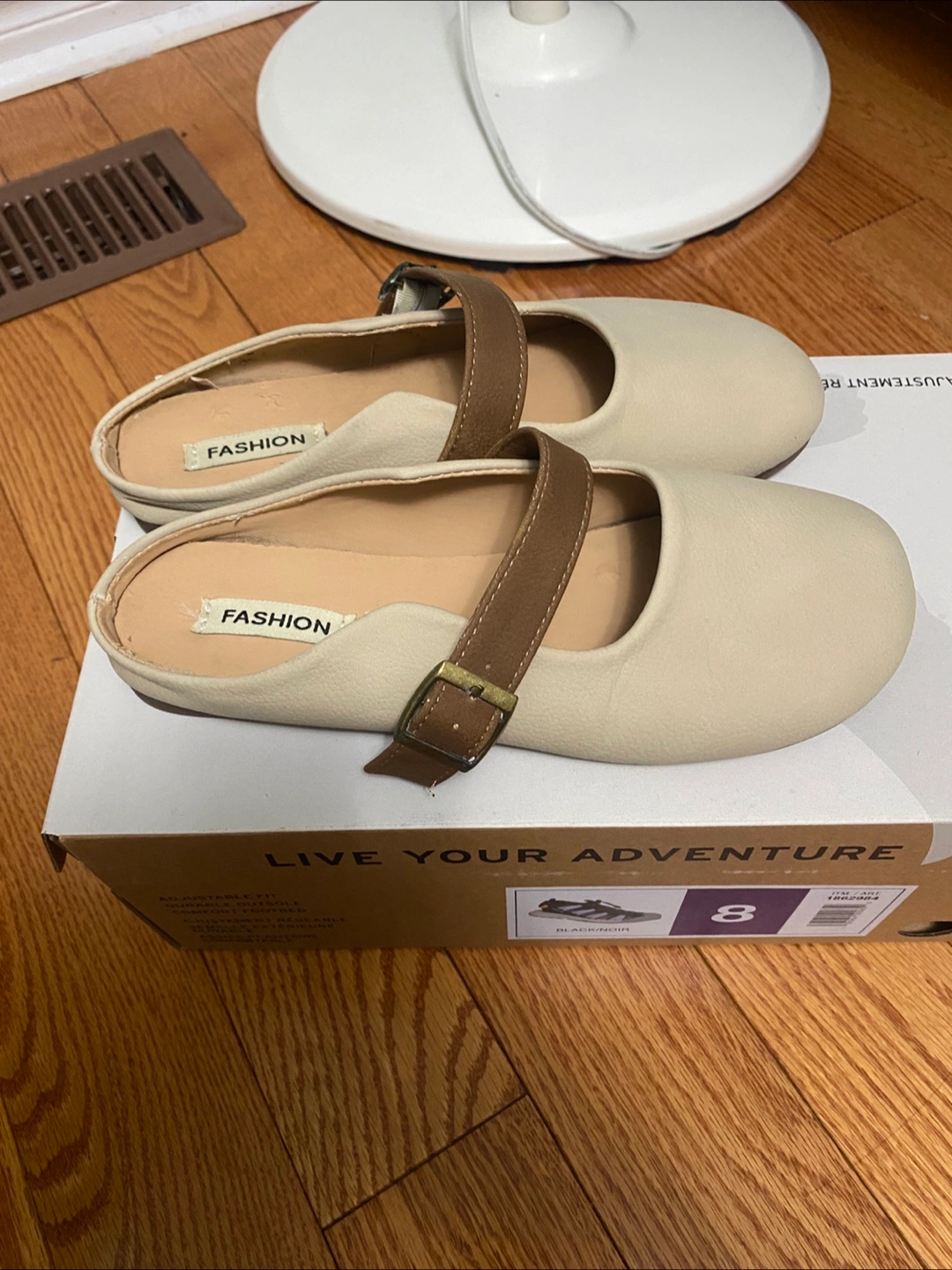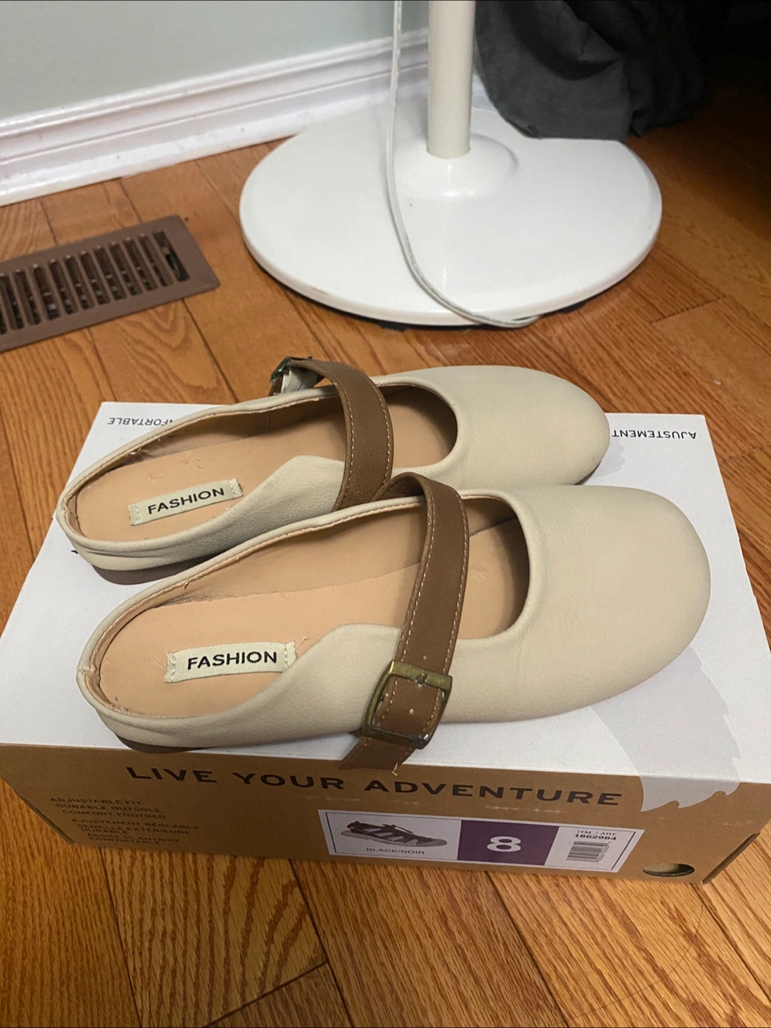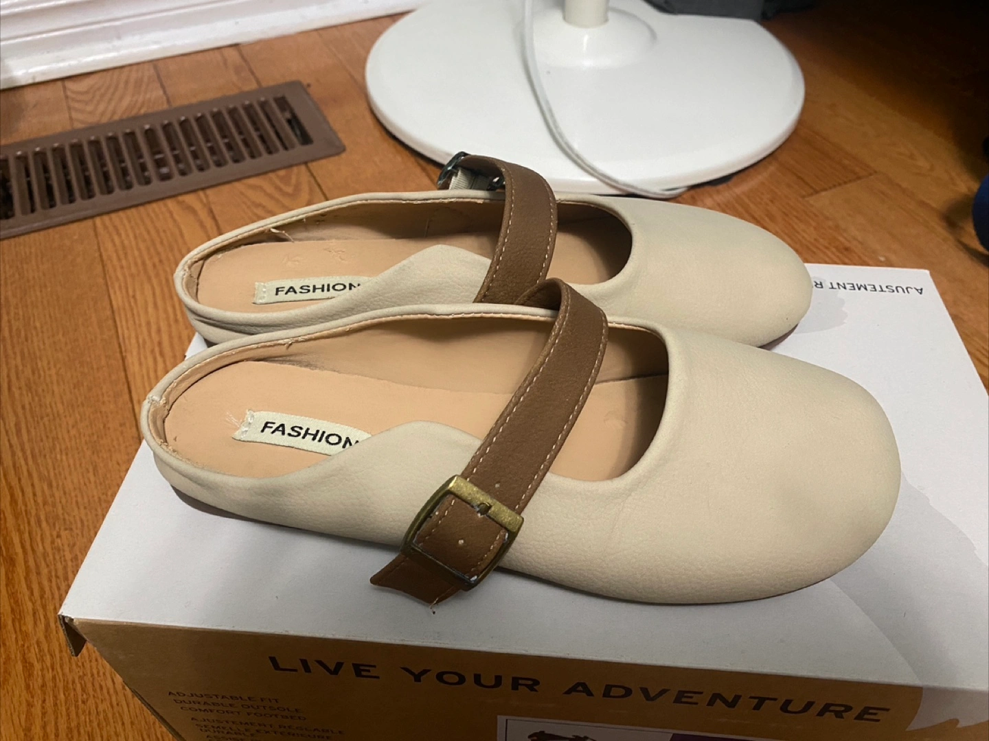 Cute beige Mary Jane style shoes with a brown strap! These are perfect for adding a touch of retro style to your wardrobe