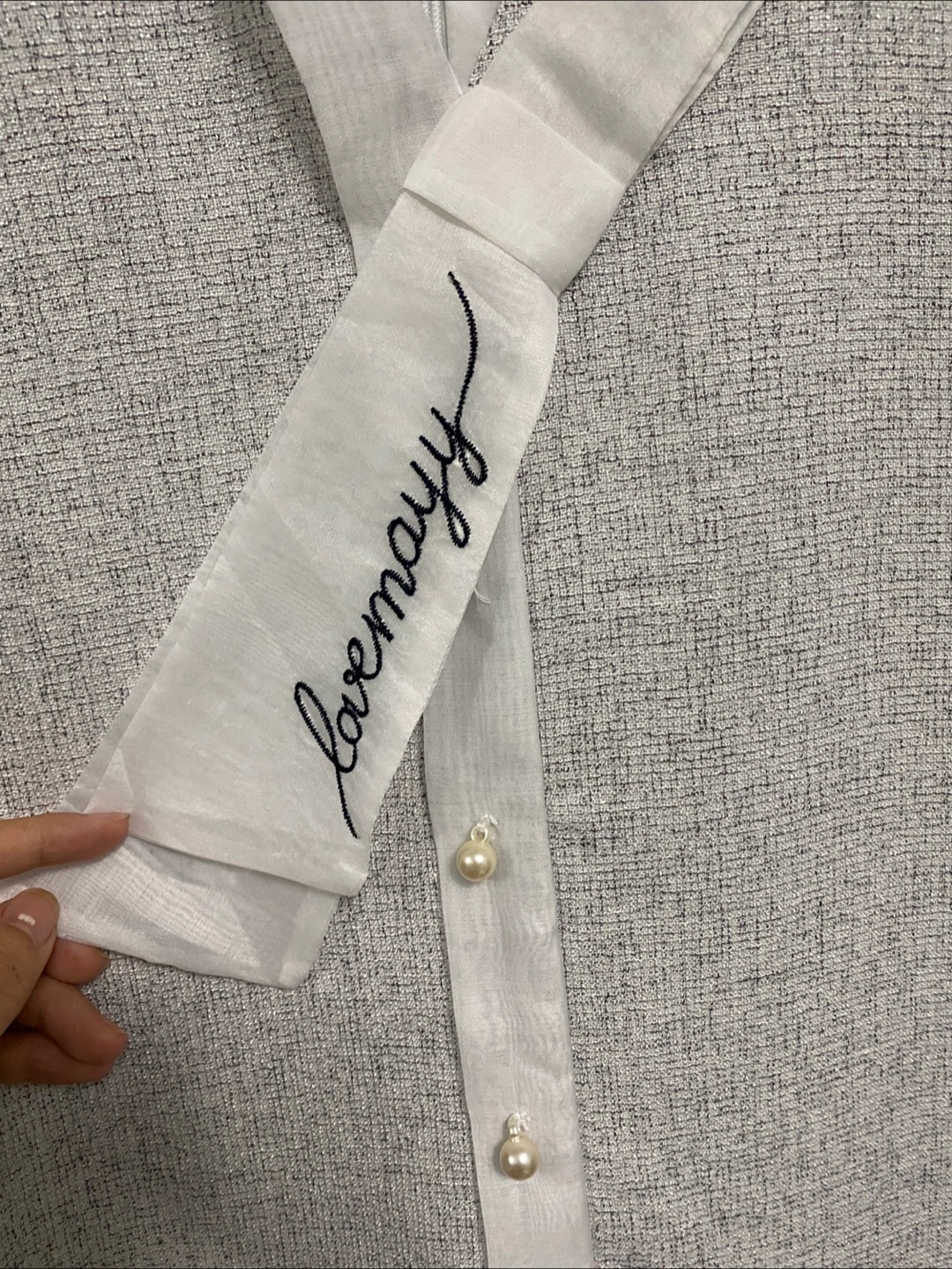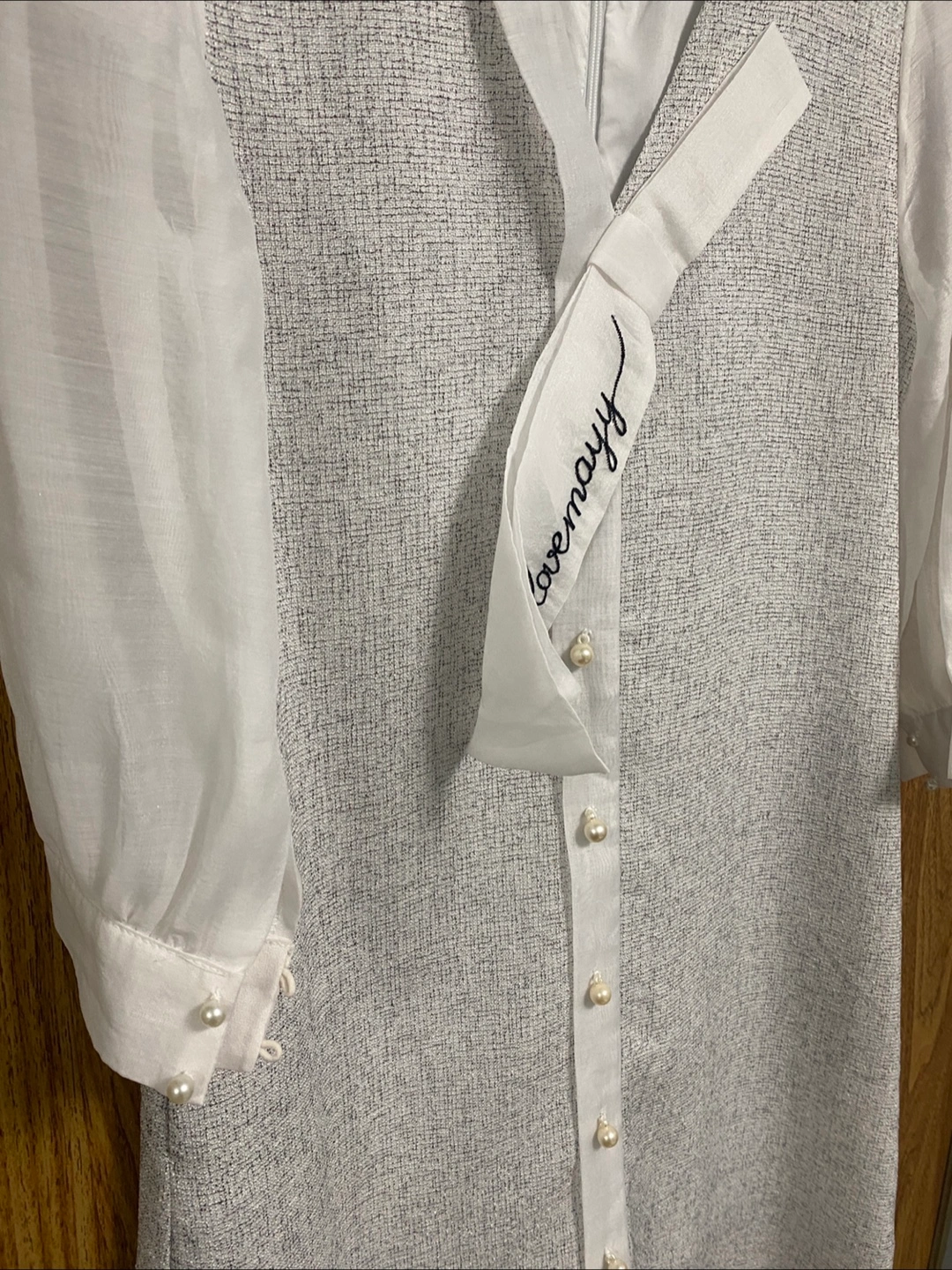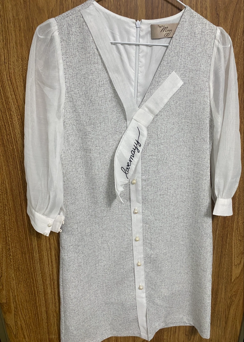 This Lovemayy dress features a unique design with sheer sleeves and a tie detail. The dress is a blend of white and grey, offering a stylish and versatile look. It's a brand new dress and ready for a new home!