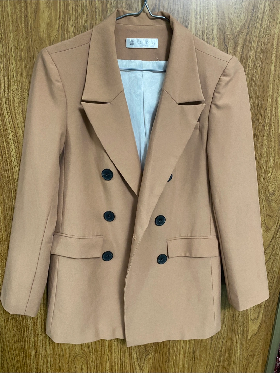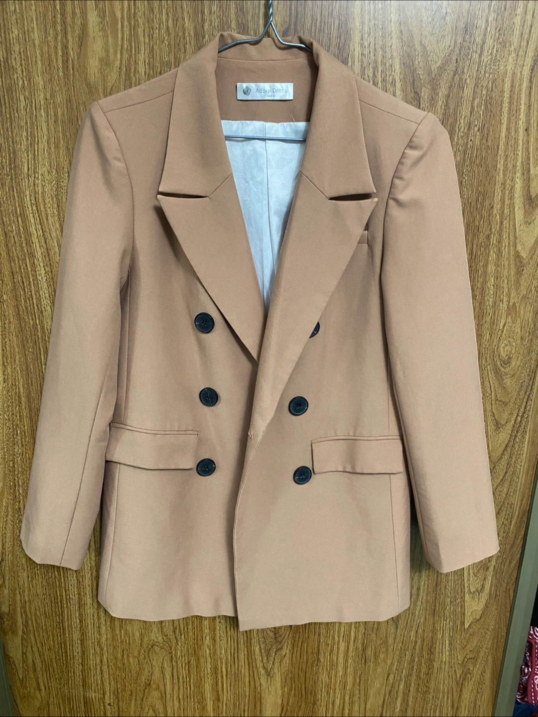 Here's a stylish beige double-breasted blazer! It's in great condition and ready for a new home. Perfect for adding a touch of sophistication to any outfit