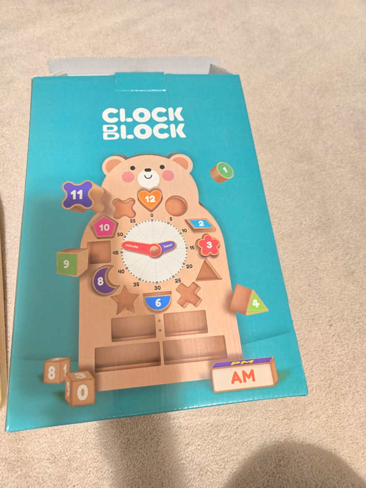 This is a cute wooden clock block toy that helps with shape sorting and learning to tell time! It is in great condition and comes with the original box