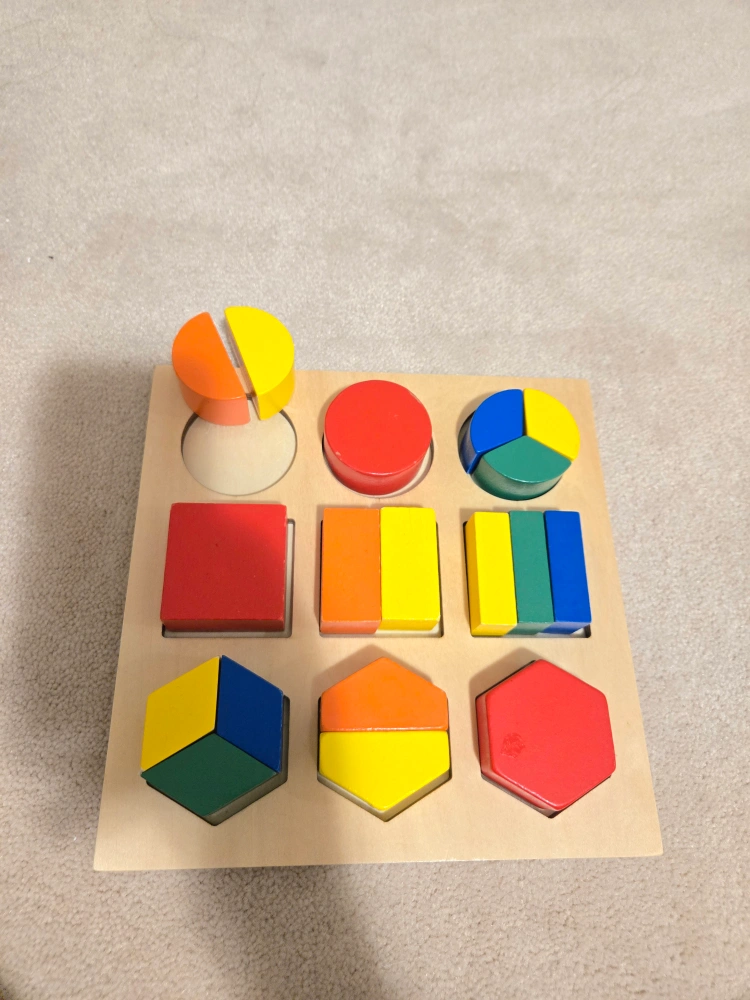 A fun wooden shape sorting puzzle! It includes various shapes and colours perfect for helping little ones learn.