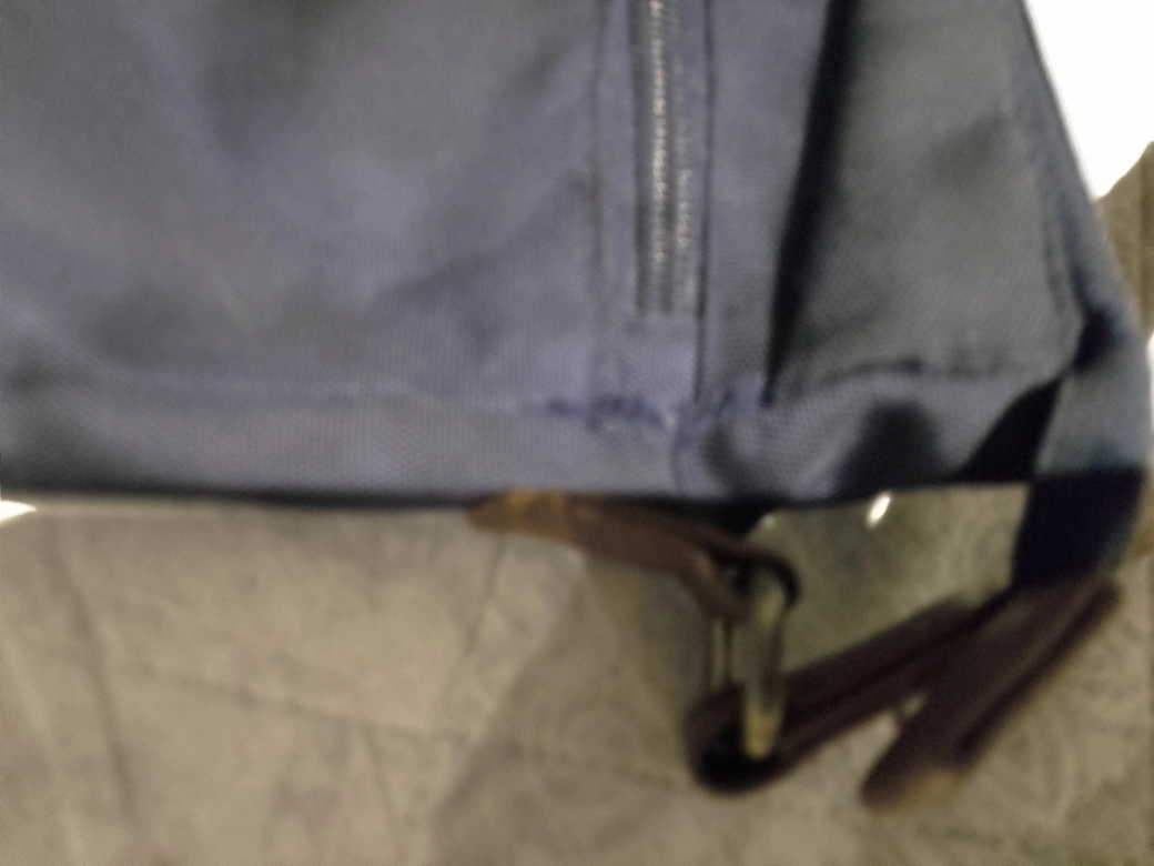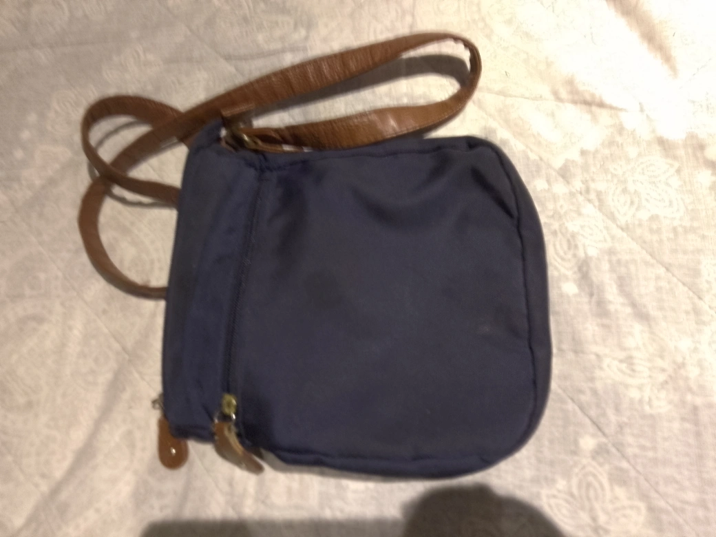 It's in good condition (except for a minor flaw in the backside as shown in the 2nd slide) and perfect for carrying your essentials. The strap is brown and adjustable, and there's 2 compartments.