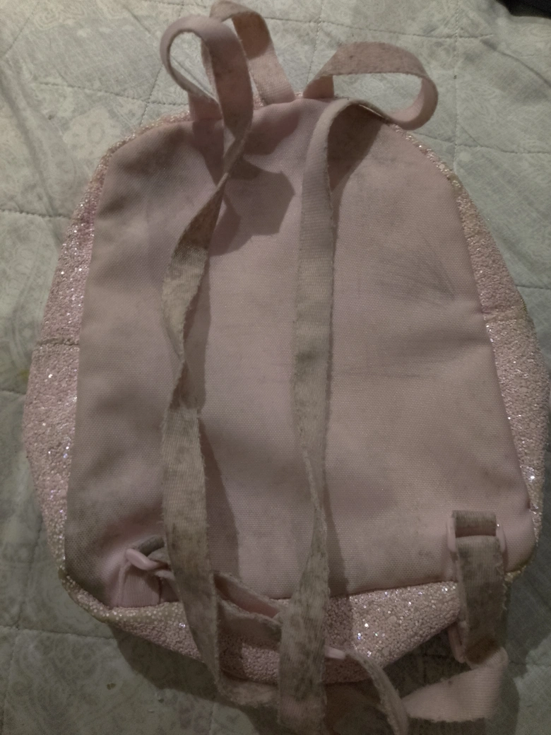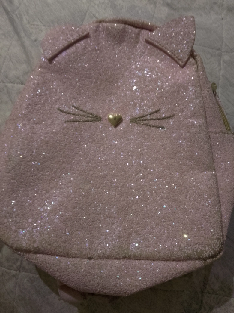 This adorable pink glitter backpack from Claire's is perfect for a little one! It features cute cat ears and whiskers, adding a touch of whimsy to any outfit. However, it's heavily stained in the back and the straps as shown in the 2nd photo. No idea how that happened. I gave it a wash but that made it cleaner but some stains are still visible. But once you use it the stains are not really visible as it's more on the backside and not really on the side which will be visible to others.