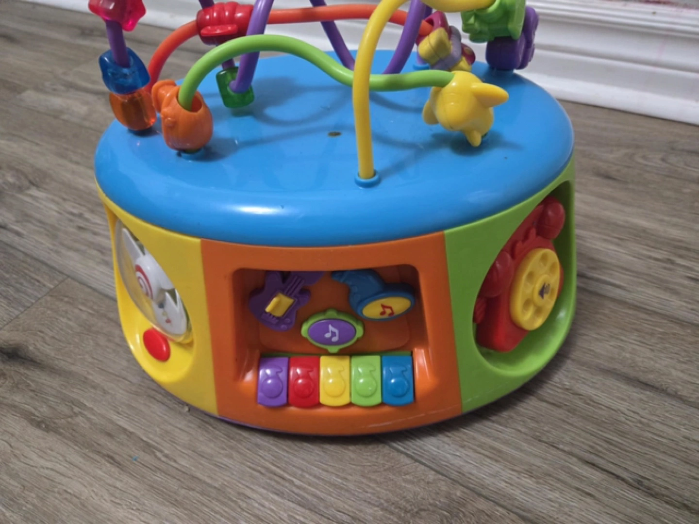 This is a fun and engaging activity cube toy for little ones! It features a variety of activities on each side, including a bead maze, musical instruments, and more. It's in great condition and ready for a new home!