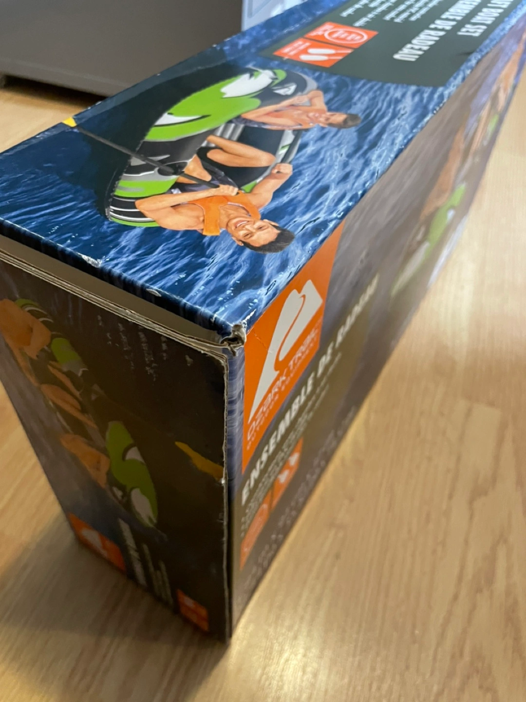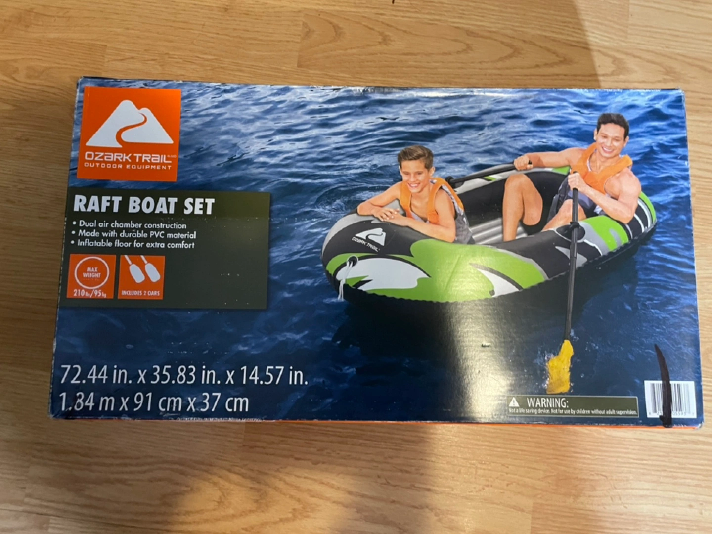 I'm selling a brand new Ozark Trail raft boat set, designed for two adults, featuring durable PVC material and an inflatable floor for extra comfort, ready for your next water adventure!