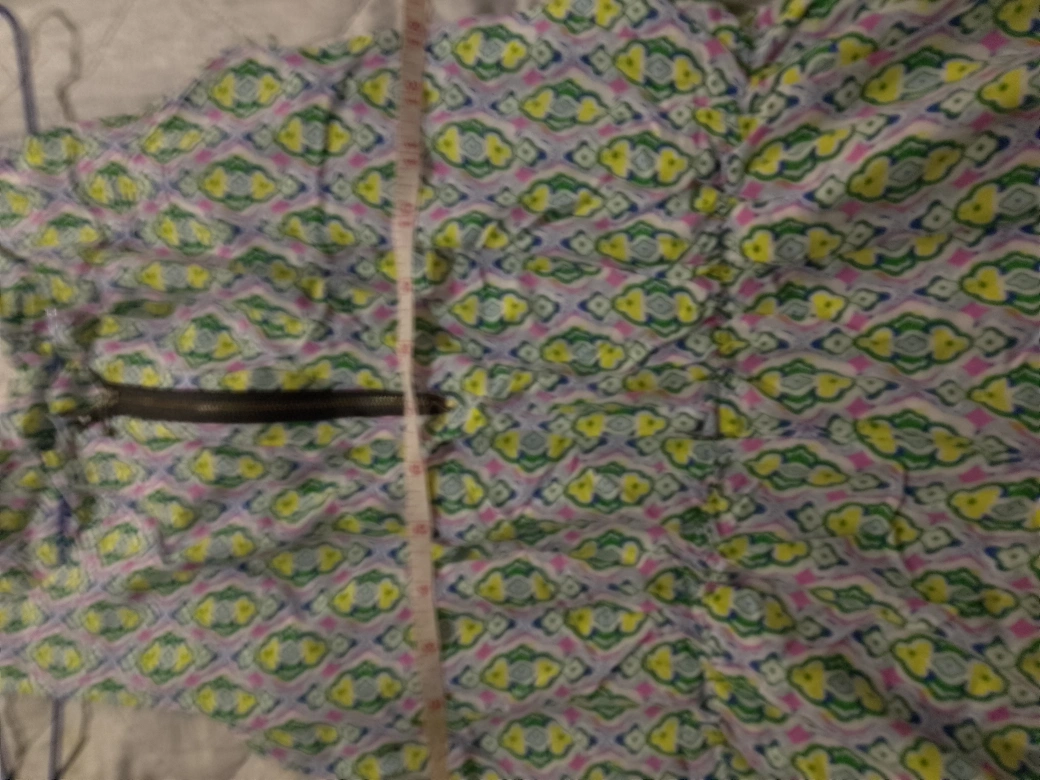 Here's a patterned jumpsuit! It has a zipper and a fun, colourful design. It's comfy and perfect for warmer weather. It's in good condition but there is a minor flaw (as shown in the last photo). However, it's not very noticeable. I assume that it'll fit from XS to Medium sized people. The size is not mentioned in the item. But I provided the measurements in the photos.